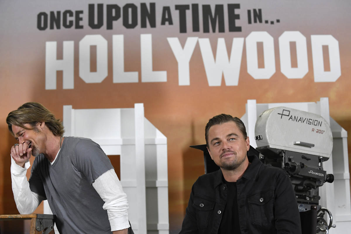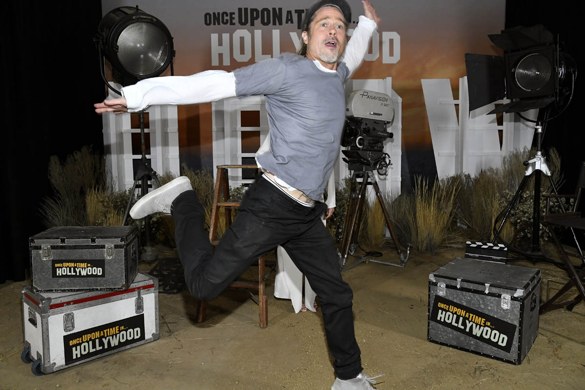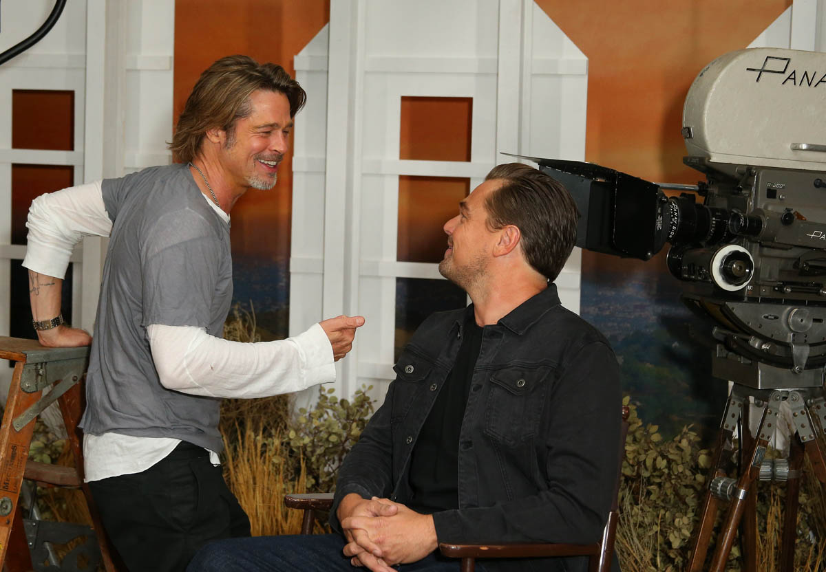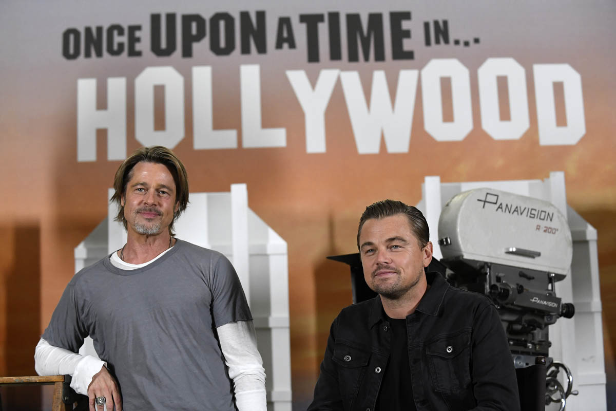 With two weeks to go, then, the final promotional push begins. Here are QT, Margot Robbie, Brad Pitt, and Leonardo DiCaprio yesterday for a photo call and Q&A in LA. Brad, as you can see, is wearing what seems to be his 2019 uniform: grey tee over a long-sleeved white tee, over utility pants, and sneakers. No cap though. Good decision. Because his hair is really, really good right now. His parents really did him a solid with the hair thing with those hair genes. Would he have been able to maintain his allure if there had been hair changes?