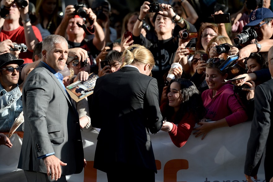 Pitt exited out the back of the theatre and didn’t stay for the entire screening. He was generous with fans who were waiting there. Later on there was a private dinner, very exclusive, very small, like maybe 25 people, at Hudson Kitchen. And then Brad Pitt hit up the Thompson Hotel rooftop, which was not closed to the public, and hung out with Michael Fassbender. He had security with him, sure, but this did not turn into a Justin Bieber situation. There was no drama. No one was punched. No one was pushed. He was friendly to people who approached – several men auditioning to be his new best friend – and he and Fassbender were able to enjoy their bromantic time together that included some serious conversation punctuated by bursts of gregarious laughter, mostly on Fassbender’s part.