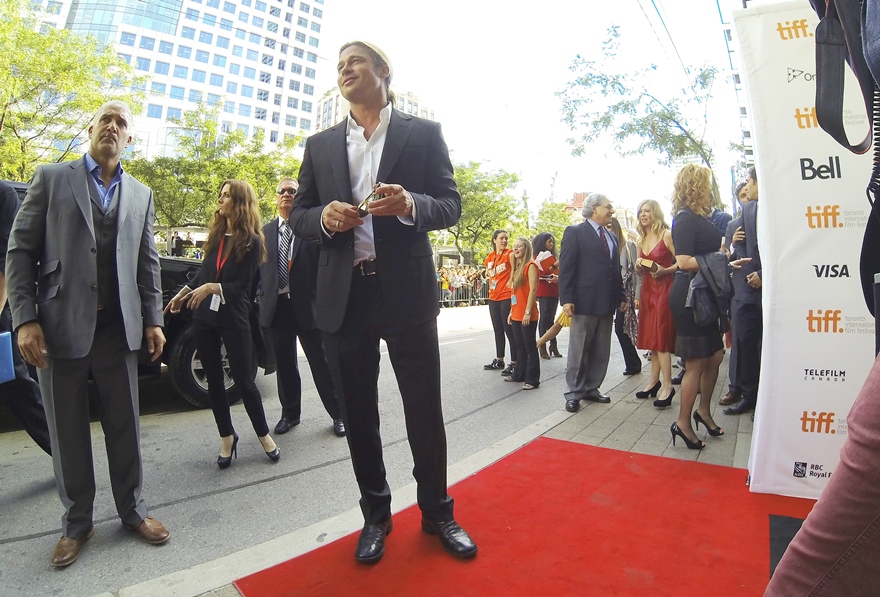 Pitt exited out the back of the theatre and didn’t stay for the entire screening. He was generous with fans who were waiting there. Later on there was a private dinner, very exclusive, very small, like maybe 25 people, at Hudson Kitchen. And then Brad Pitt hit up the Thompson Hotel rooftop, which was not closed to the public, and hung out with Michael Fassbender. He had security with him, sure, but this did not turn into a Justin Bieber situation. There was no drama. No one was punched. No one was pushed. He was friendly to people who approached – several men auditioning to be his new best friend – and he and Fassbender were able to enjoy their bromantic time together that included some serious conversation punctuated by bursts of gregarious laughter, mostly on Fassbender’s part.