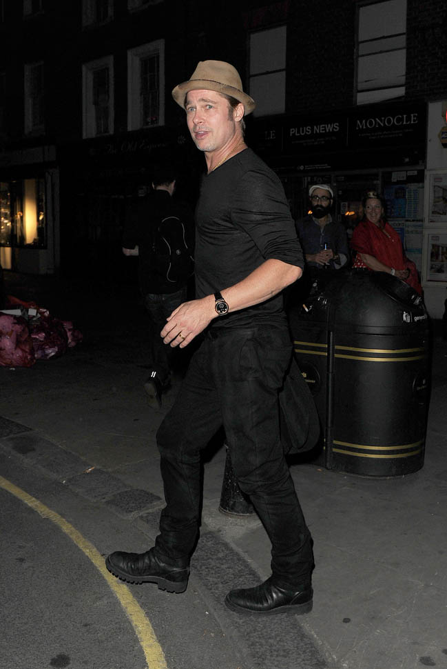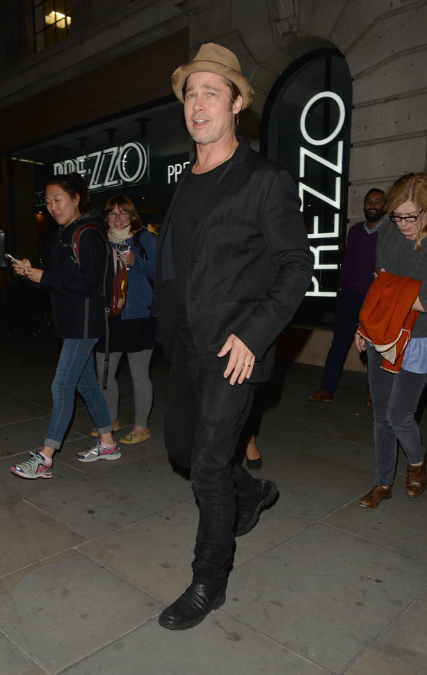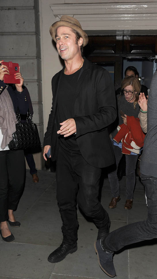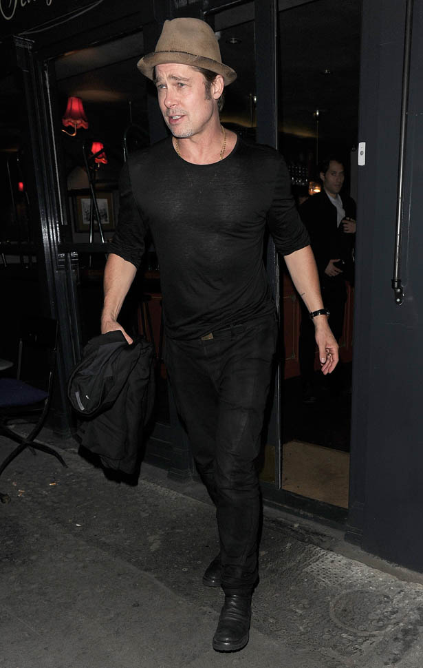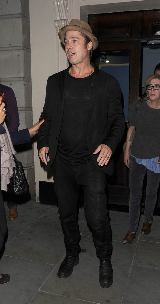 Brad Pitt was papped in London last night. He went to see Bradley Cooper in The Elephant Man. But the main reason he’s there is to attend Guy Ritchie’s wedding. Guy’s getting married today. Other guests include David Beckham and Jason Statham. The Daily Mail is rumouring that George and Amal Clooney and also Gwyneth Paltrow have been invited. That sounds like bullsh-t to me but whatever. Brad’s sleeping in a luxury tent tonight on Guy’s estate where the wedding will take place.