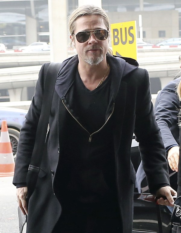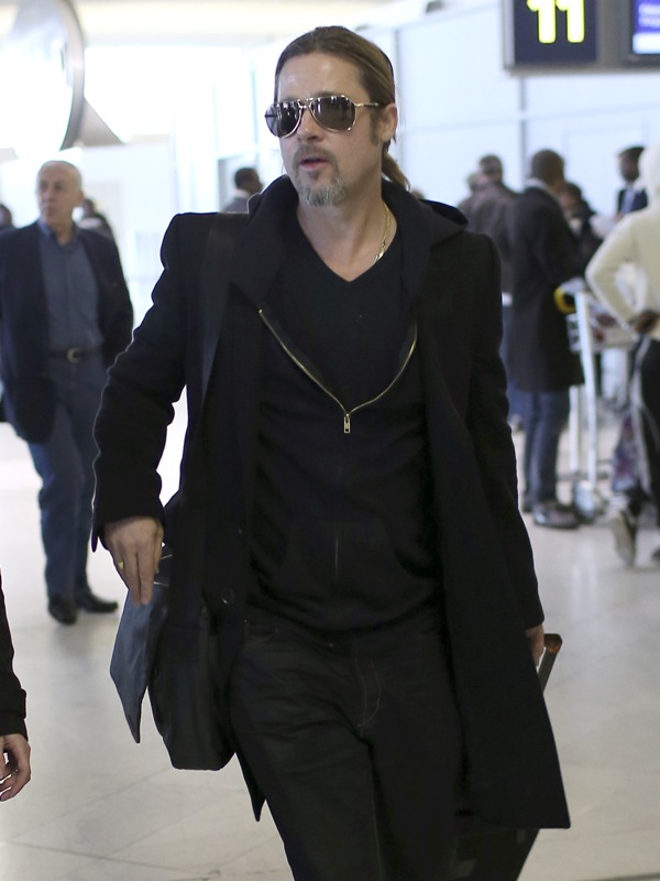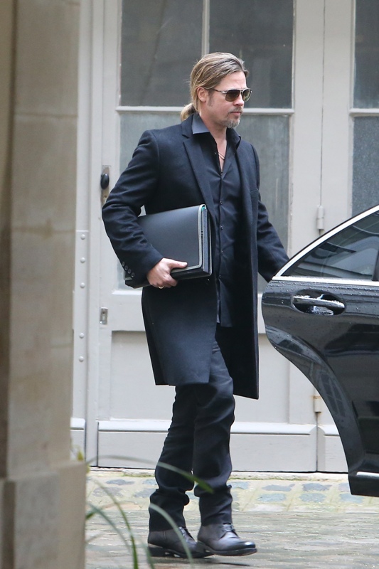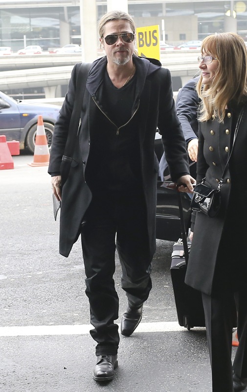 Brad Pitt was in France for a quick couple of days on an art trip. I appreciate how economical he was with his wardrobe -- just a long coat and black jeans, alternating between a t-shirt and hoodie and a black shirt. See attached below of Brad with his art folder tucked under arm in Paris, and then arriving back in LA yesterday.
