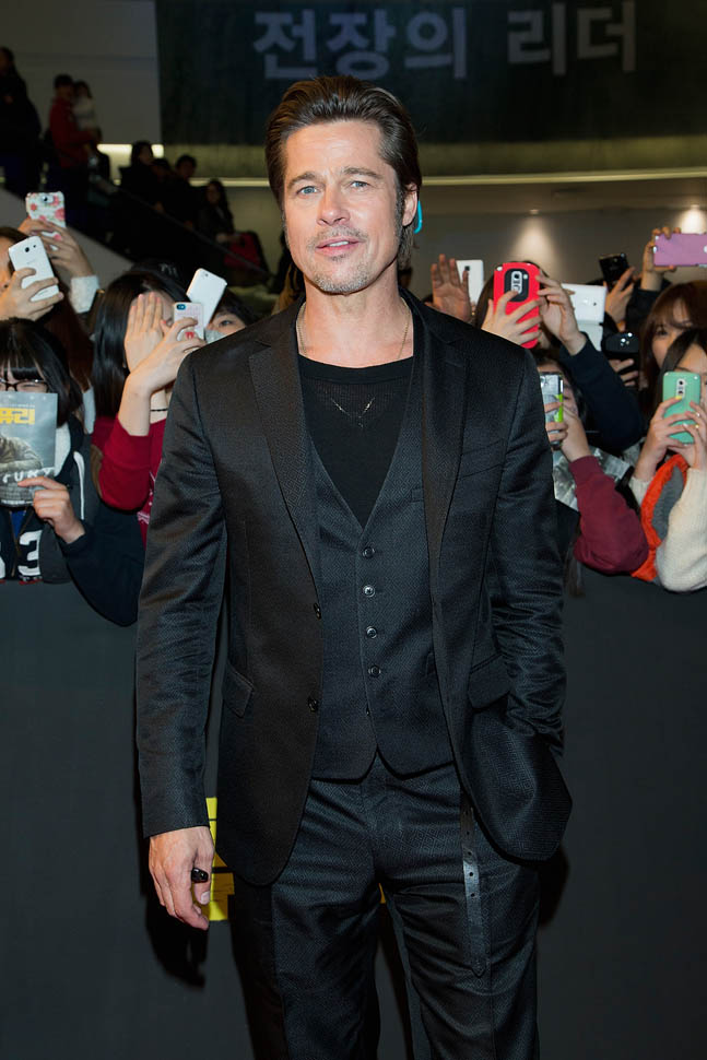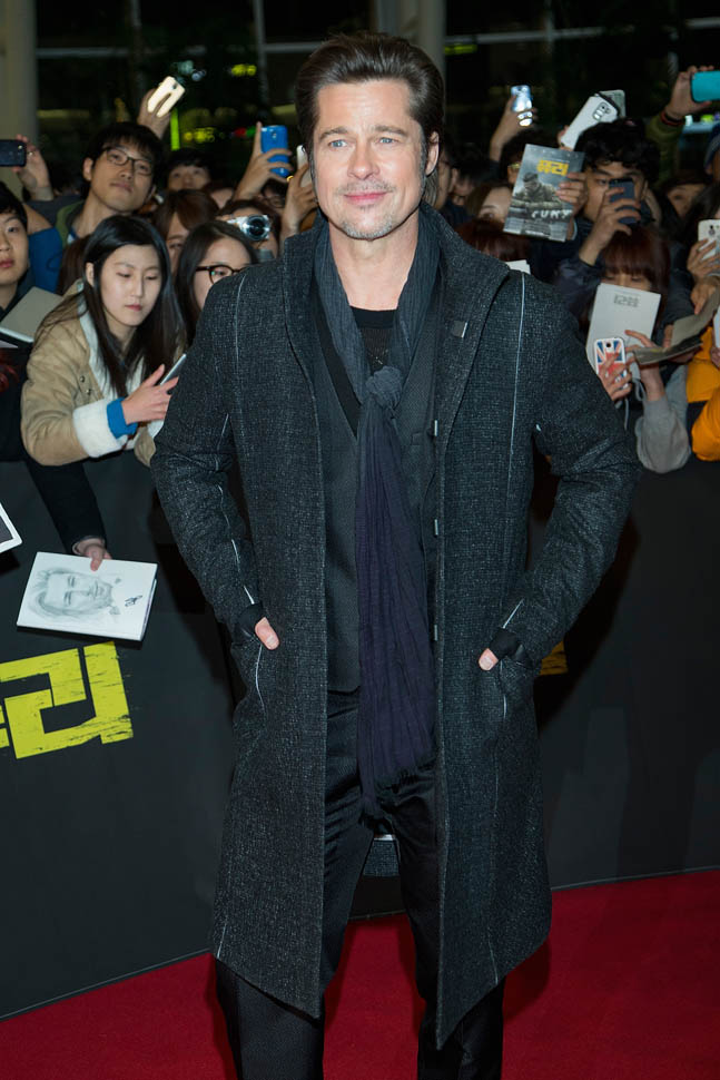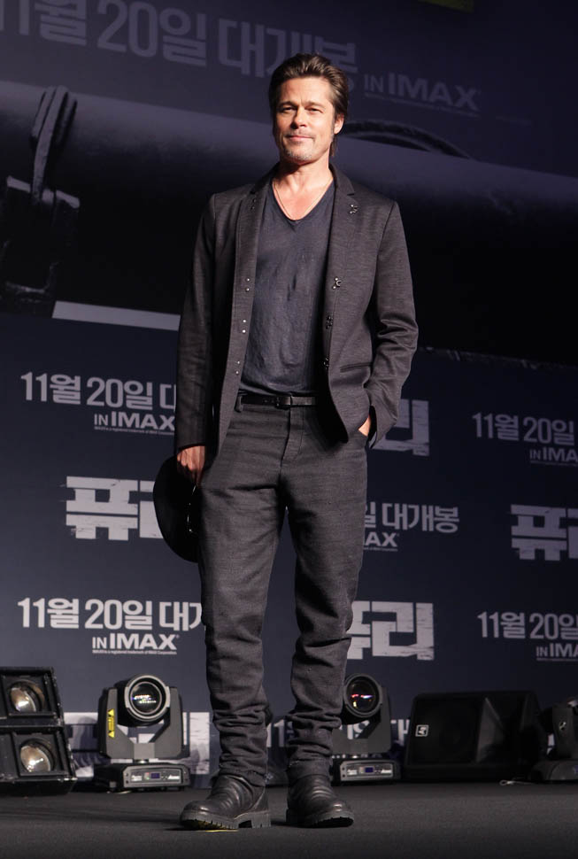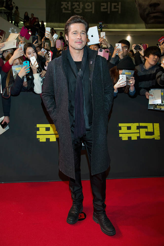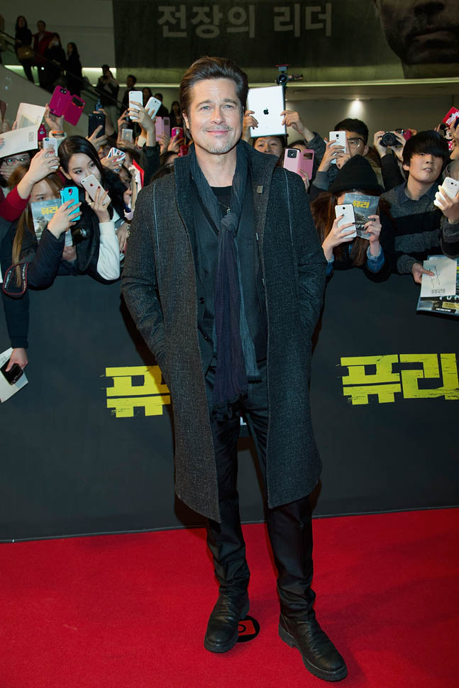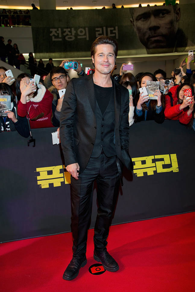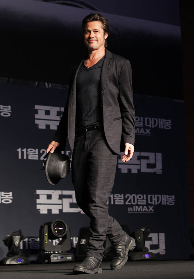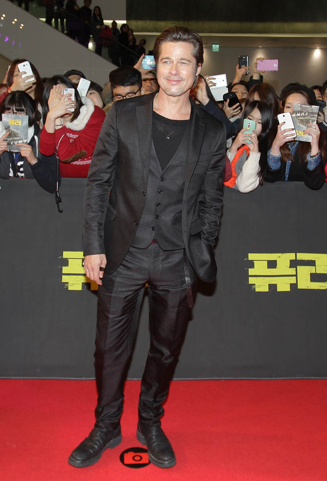 Here's Brad Pitt in Seoul, South Korea today at the premiere and press conference for Fury. He looks rested, a lot better than yesterday when he came off the flight -- click here for a refresher.