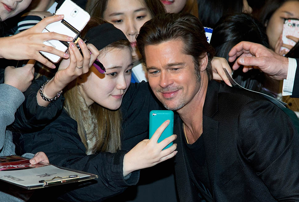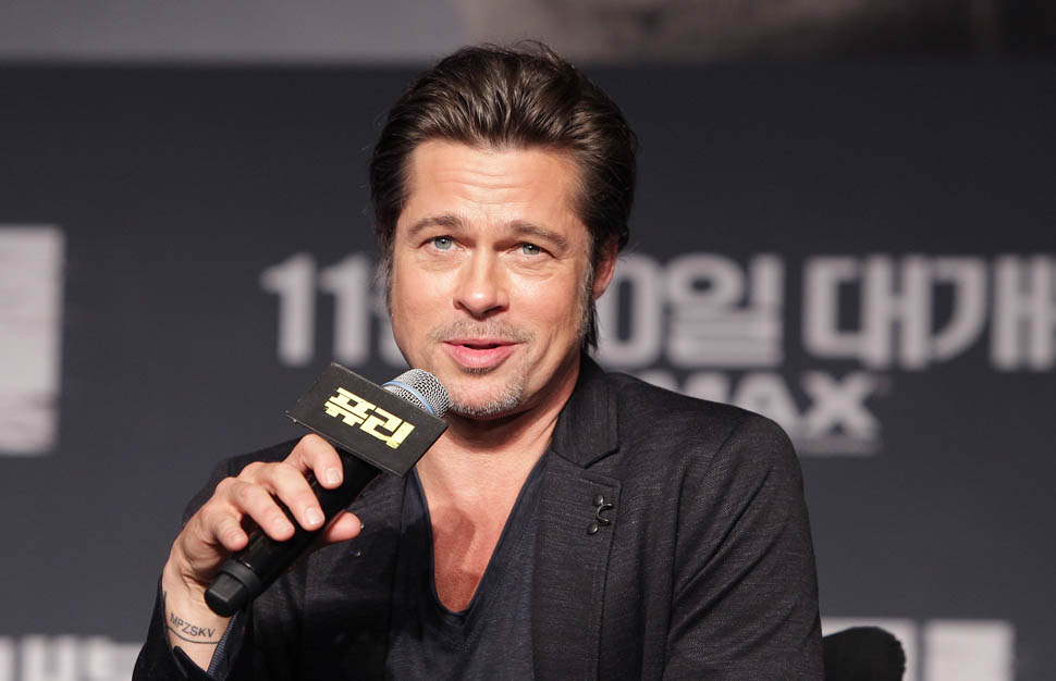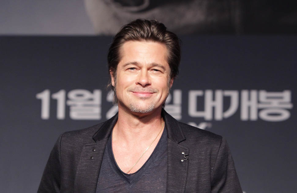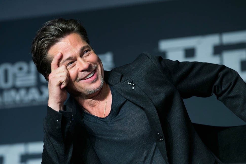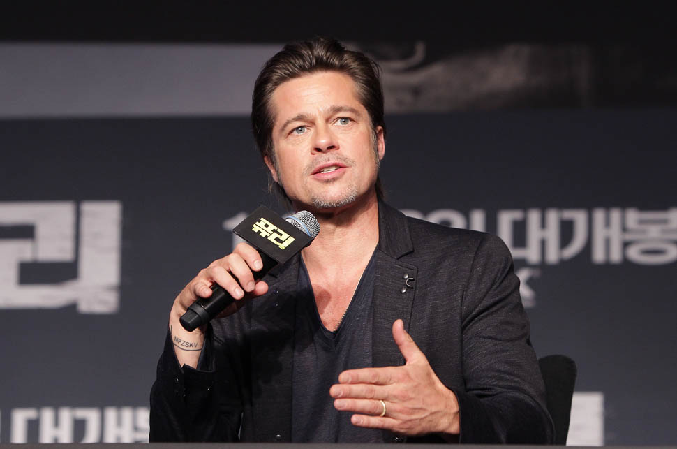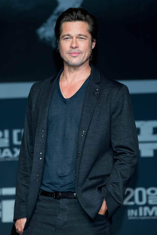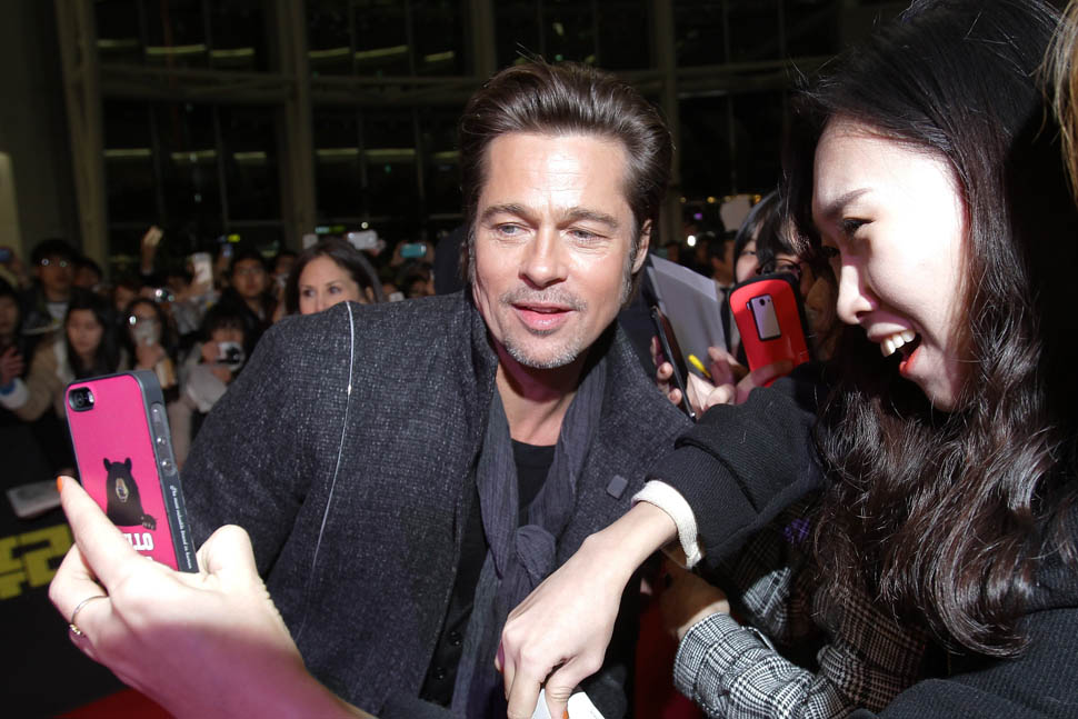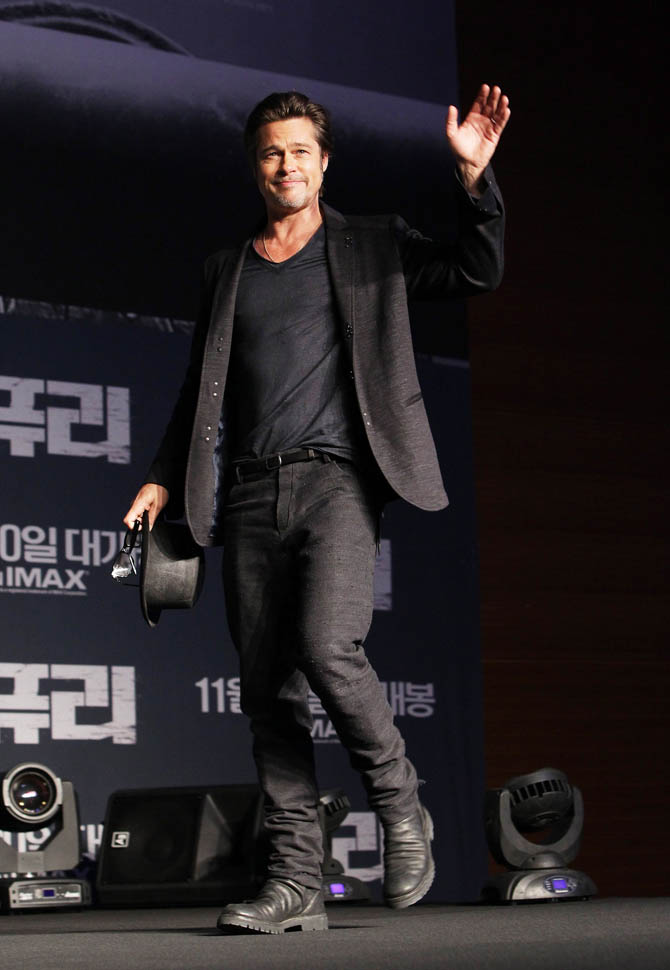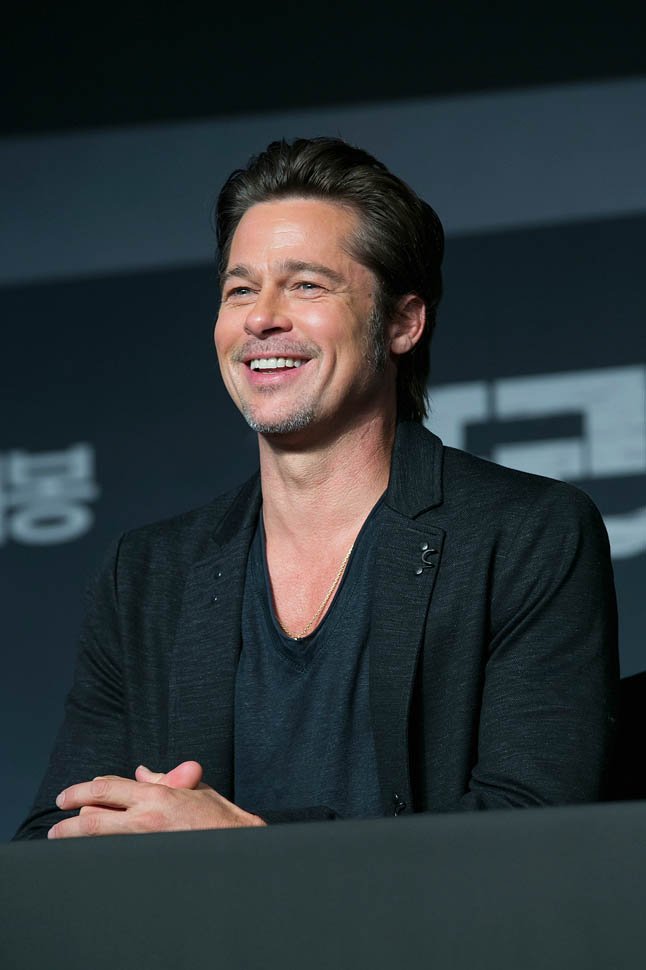 Here's Brad Pitt in Seoul, South Korea today at the premiere and press conference for Fury. He looks rested, a lot better than yesterday when he came off the flight -- click here for a refresher.