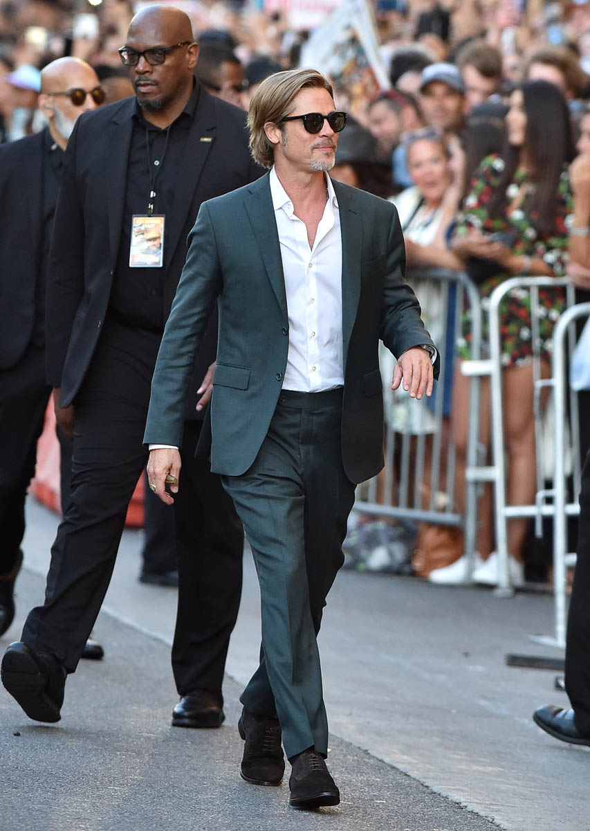Watching big stars avoid traditional press is becoming its own form of entertainment. Beyoncé comes to mind, obviously, but Angelina Jolie doesn’t much do the talk show circuit either. And she too has written her own essays for fashion magazines. Angelina junketed for First They Killed My Father though and with Maleficent coming up, given that she’s the title character, and it’s Disney, I wonder what her press tour will look like. I interviewed her on the first Maleficent junket, a proper junket-style interview, but to say she’s “accessible” the way we’ve seen other actors on promotion would be an exaggeration. And, of course, same goes for Brad Pitt and Leonardo DiCaprio who are currently promoting Once Upon a Time in…Hollywood. Last night was the premiere. They dropped by Jimmy Kimmel along with Margot Robbie.