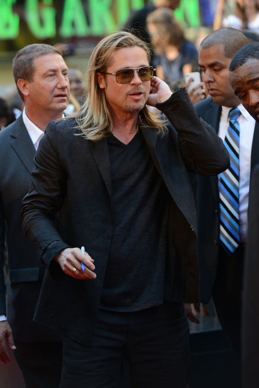 Here’s Brad Pitt last night at the NY premiere of World War Z. We were talking yesterday about Brad Pitt’s Carb Face Hustle and whether or not it’s filler, which is what I think. Because his neck is the same size and his body changes don’t correspond to his face expansion. And no matter how much contouring his makeup artist is trying, the extra anti-aging padding is still there. When you combine that with the long hair, well, the effect is...