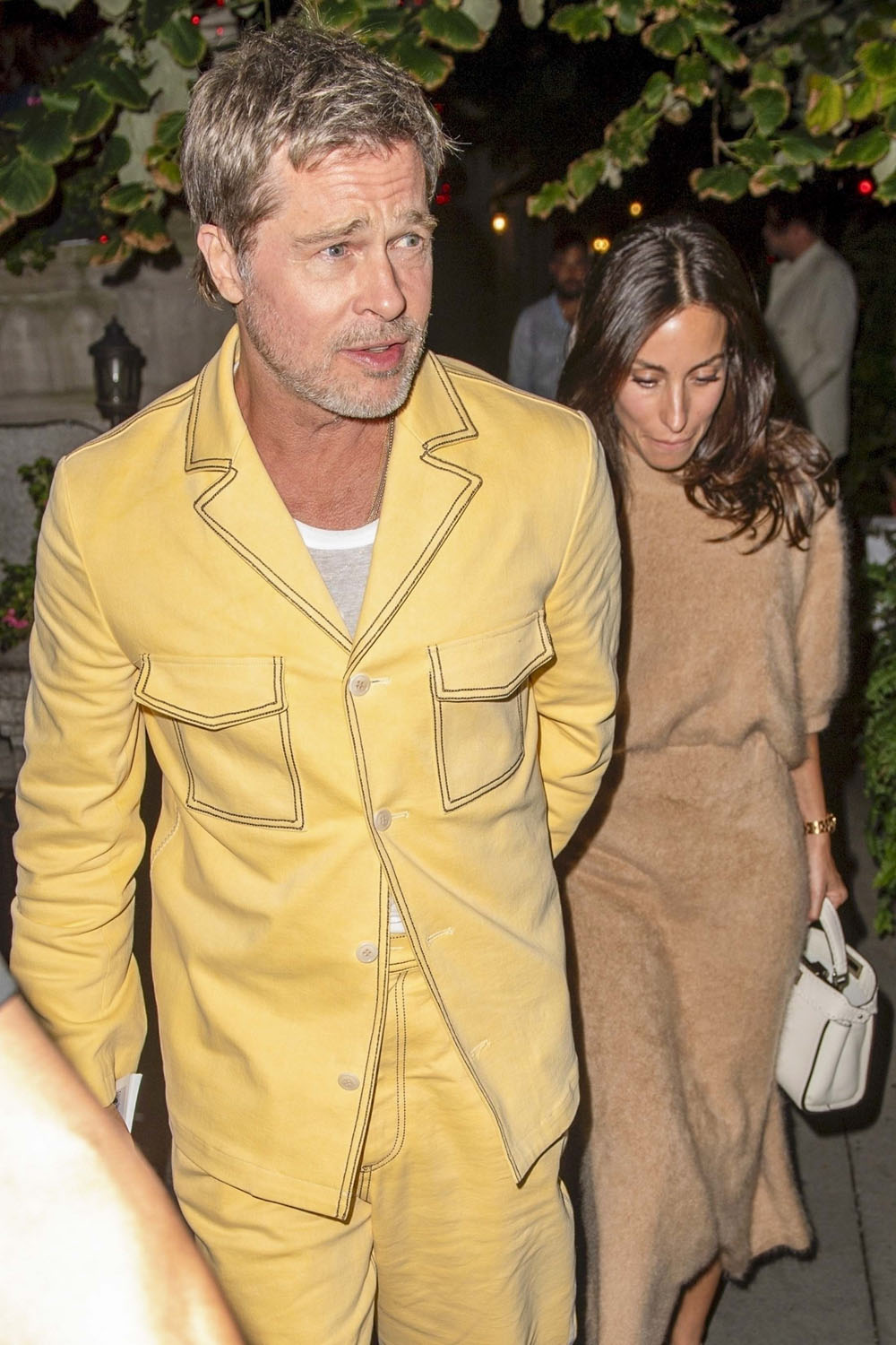 These are the ones I have access to through our agencies, the ones of Brad in his yellow suit. There are also photos of him in a white shirt, unbuttoned down to his chest, over a pair of red print baggy pants that you can see here at PEOPLE, scroll down. What’s funny, at least to me, is that when I first looked at these images, the screen on my laptop had landed on the page where their heads were cut off and you could only see from neck down. So, for a moment, I thought Brad was Travis Kelce, LOLOLOLOL. Because, well, Travis Kelce would totally wear these clothes.