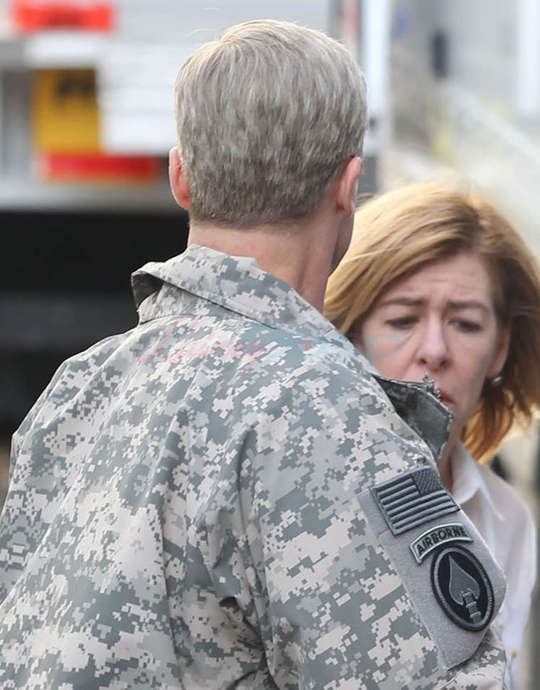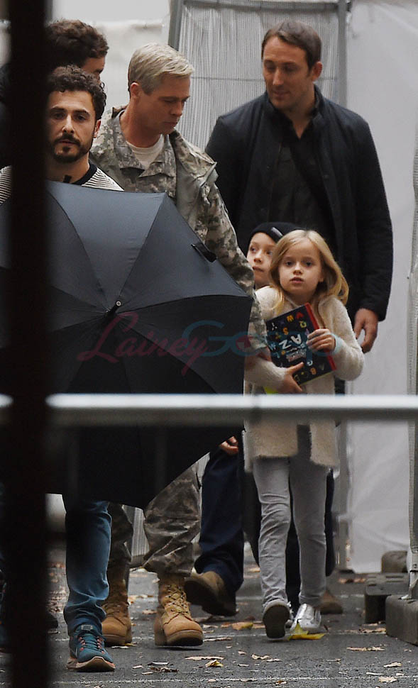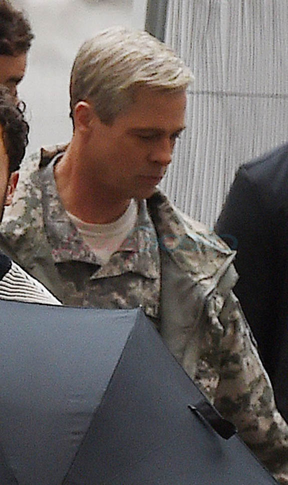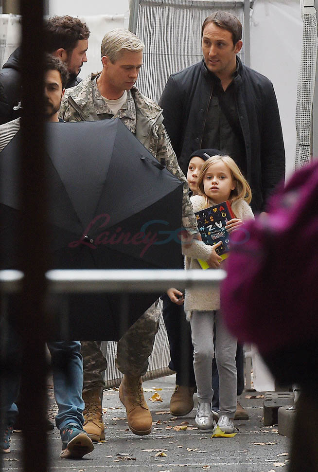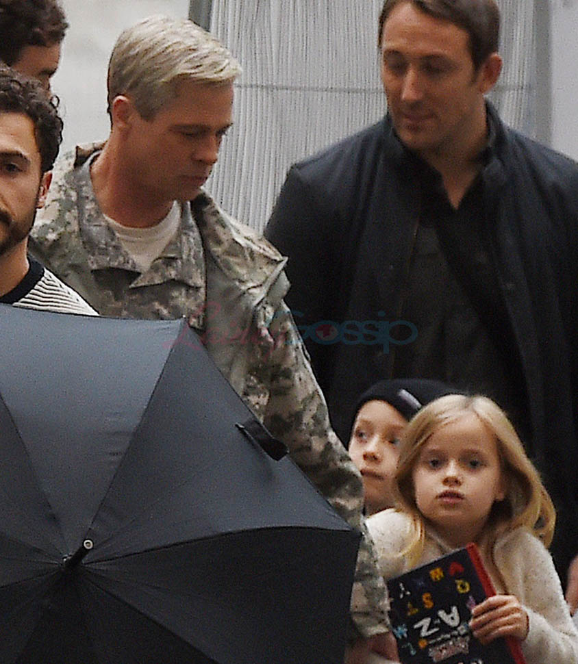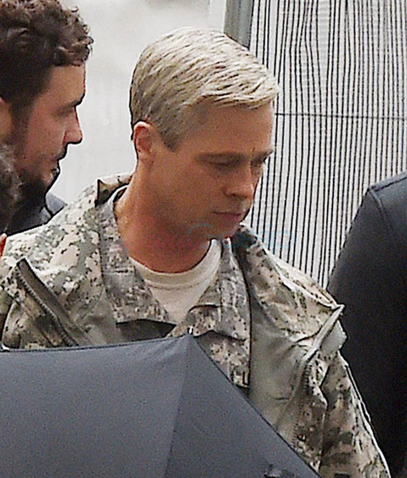 On Friday I called it a Brange takeover when VOGUE released the Angelina Jolie cover and the interview, in which it was confirmed that London is home for them now. And that’s where we find Brad Pitt, last week, on the set of War Machine (his Netflix movie), with Vivienne and Knox, in camo costume, with his hair trimmed tidy, neatly combed to the side, and totally grey.