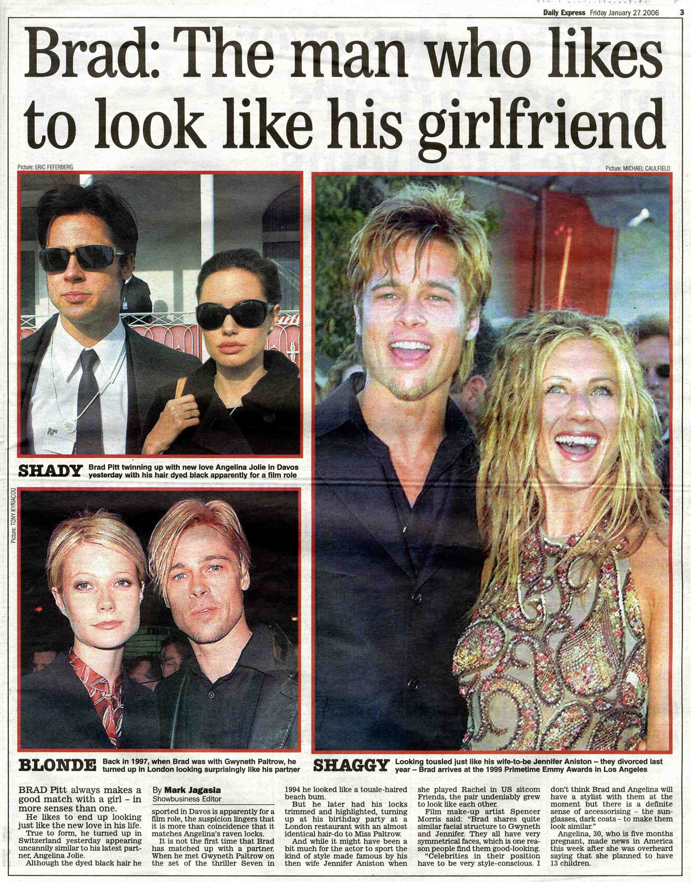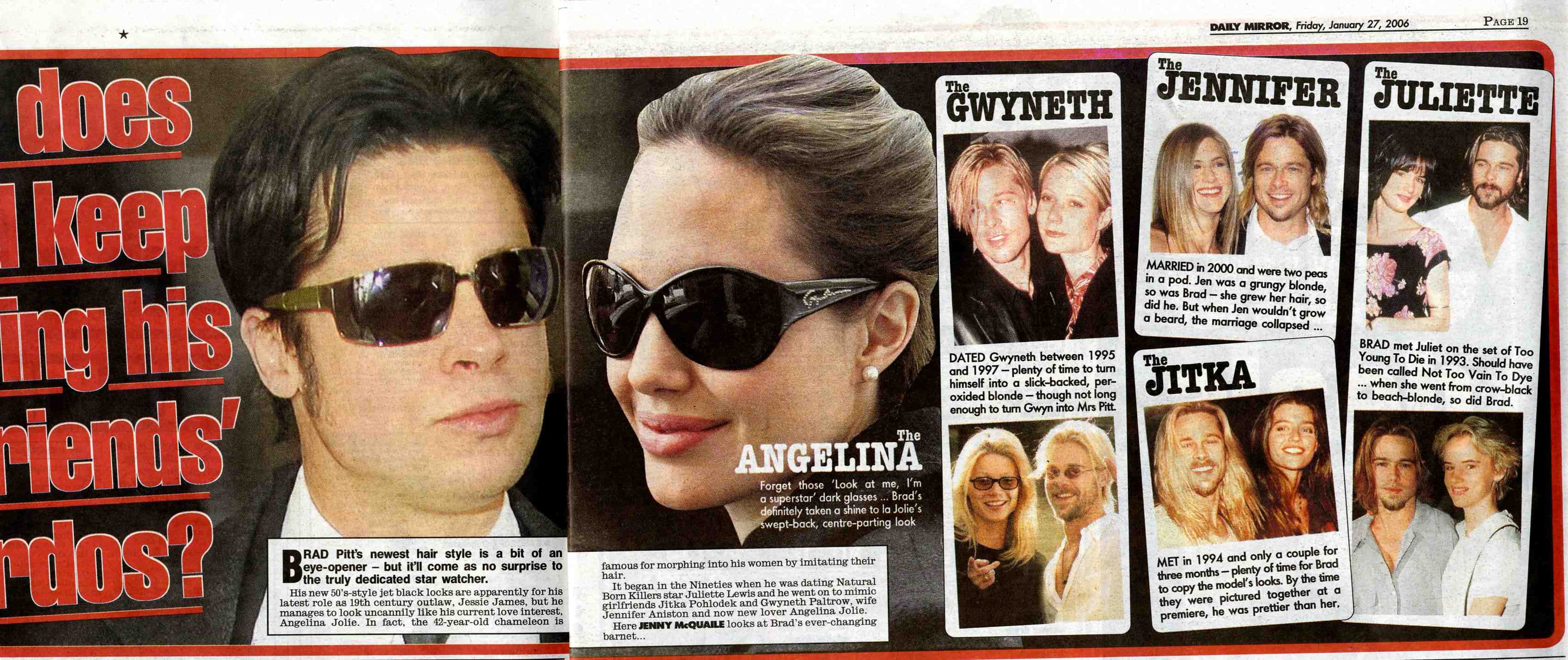 From Blaine N: on Brad and his ladies I do need to point out to you the overwhelming evidence that Brad Pitt has a very strong predeliction towards physically morphing into his significant others. Let"s go back, starting with Gwyn: matching straw-blonde hair, at points they even had the same hair cut, waifish physique, pale. Jen Aniston: matching golden blonde, more muscular, wavy long hair at points, golden/tan. Angelina: dark hair (way past filming of jesse james), pale...then the plane flying, goodwill stuff, exotic "acquired" children.I dunno, I feel like brad has a personality problem (like it doesn"texist) so he just becomes who he is in love with...very weird...but the pics don"t lie...even with juliette lewis and robin givens...its like the roving identity of mr. pitt. Dear Blaine, First of all, I love your name. I have loved it since Pretty in Pink with Andrew McCarthy and his adorable white suite/pale shirt combination. Don"t you miss the 80s??? Anyway, about Brad. Yes, I"ve seen the recent tabloid photos, attached here courtesy of Catherine K (thank you darling!). I have no idea why he does this but I hesitate to believe that he has a non existent personality. From everything that I"ve heard, he has more personality quirks than you can imagine. My only guess, as cheesy as this sounds, is that the man is in love with love. Every time he falls for a woman he FALLS HARD. And it"s not just his looks, it"s also his outward profession of love. With Gwyneth at the Globes, with Gwyneth everywhere, with Jen and his "Jen" necklace, holding her purse backstage at the Emmys, decorating her dressing room with roses that spelled out "I Love My Wife". I think he"s just really into large scale, overt expressions of his passion and naturally this extends to his physical appearance. Is it creepy? Ummm…maybe a little. But let"s not kid ourselves. A lot of chicks dig this kind of stuff. And if it were happening to you at the hands of Brad Pitt, you wouldn’t be able to resist either.