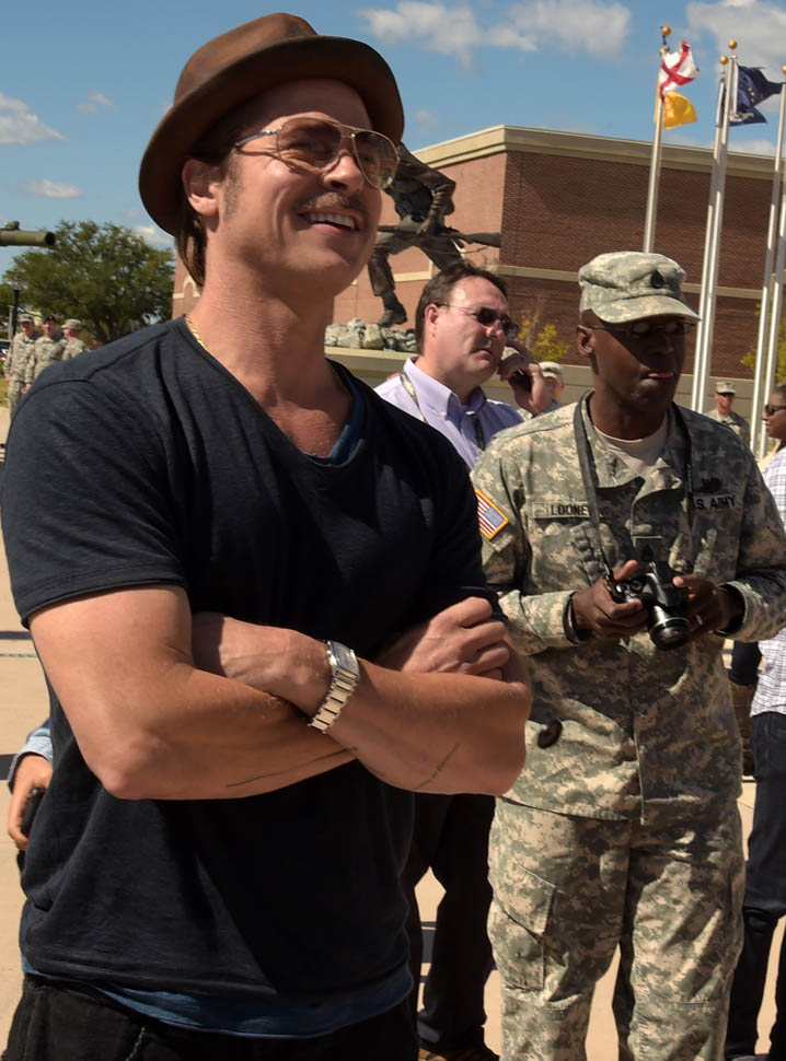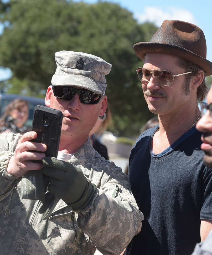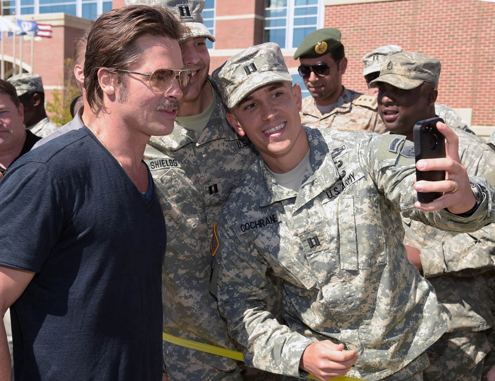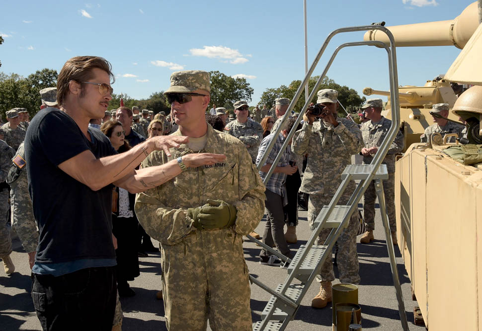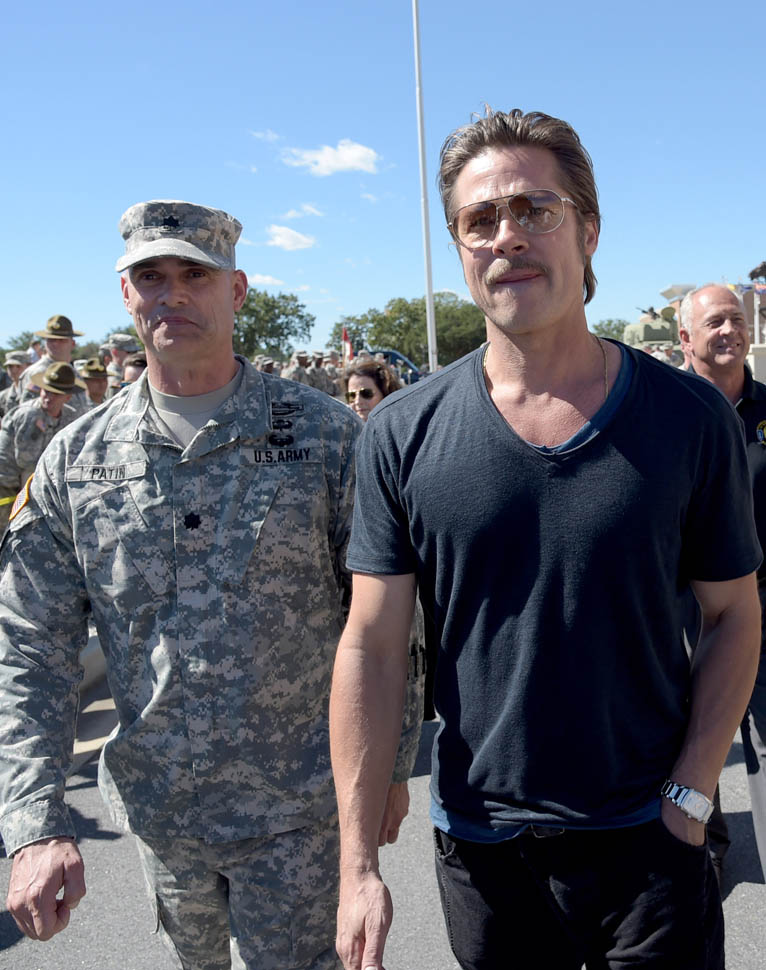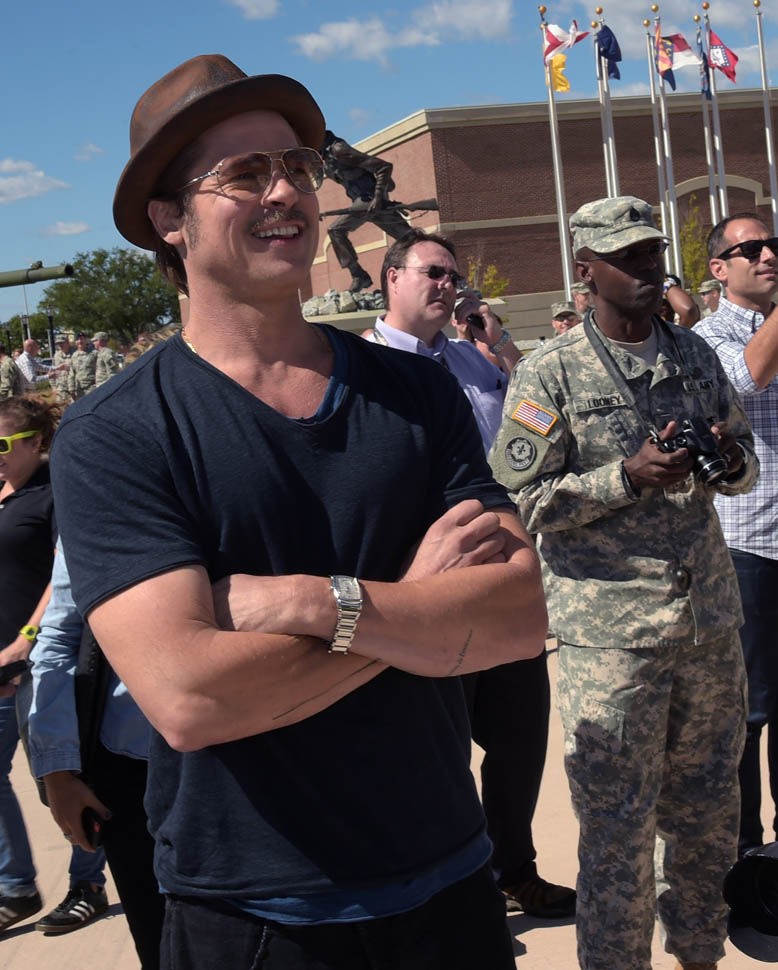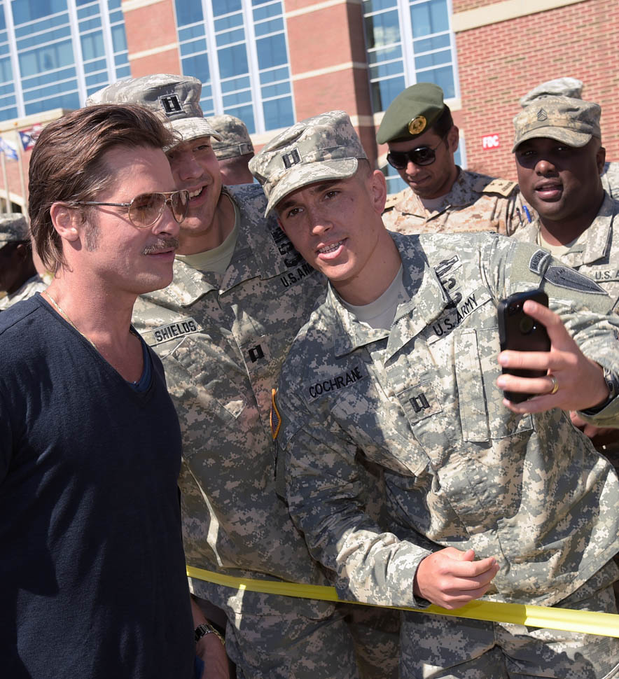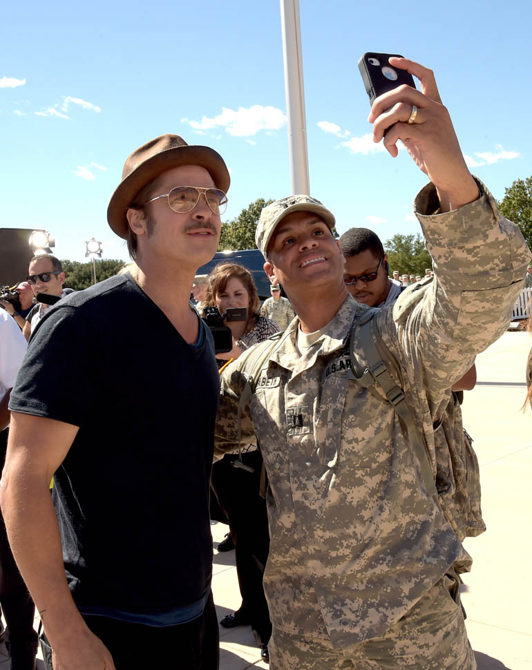 Brad Pitt and the cast of Fury spent yesterday screening Fury for veterans and servicemen in Fort Benning Georgia. Extra also released Brad’s red carpet interview from the premiere in Washington the night before. The reporter was Jerry Penacoli who’s always had a good relationship with Angelina Jolie. Which is why he was probably able to get a lot more personal than is normally allowed in these situations with celebrities. And probably why Brad decided to reveal more than he normally does in these situations, discussing how it feels now that he can call the Jolie his “wife”. And George Clooney comes up too. Click here to watch.