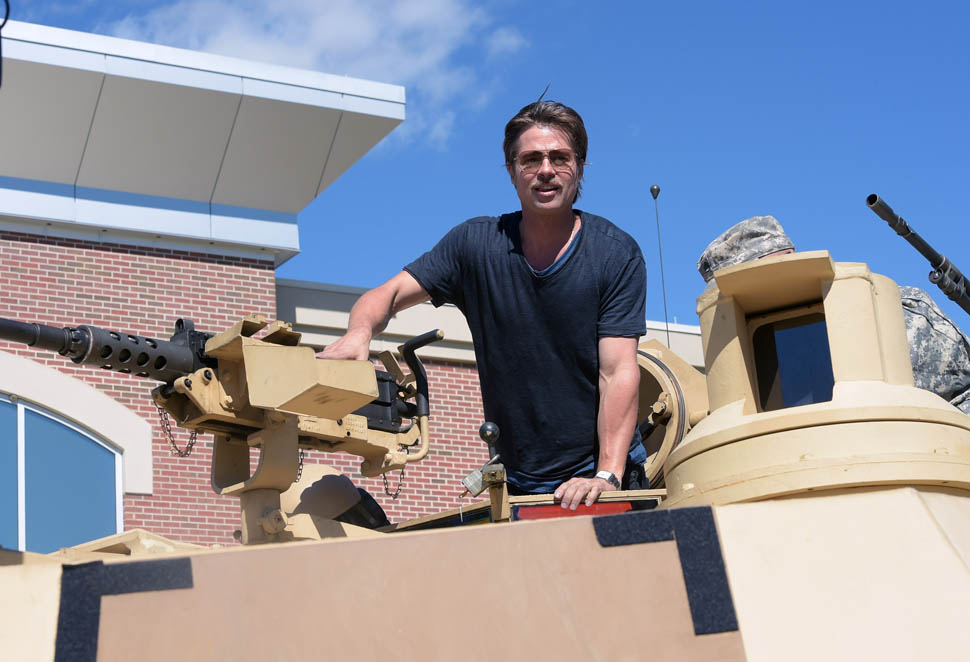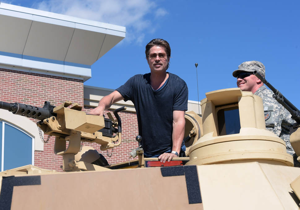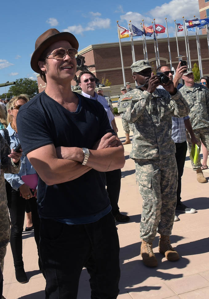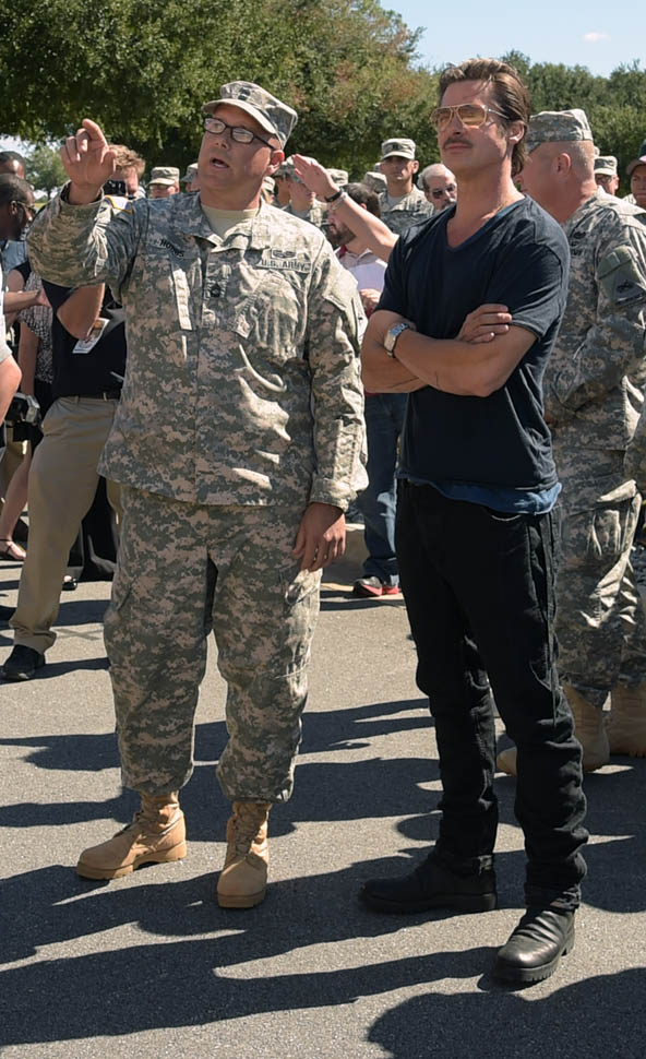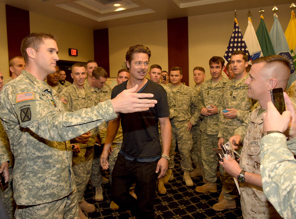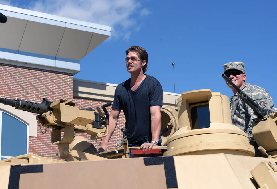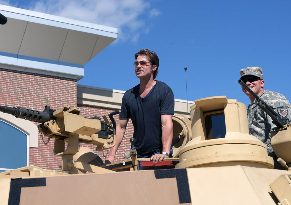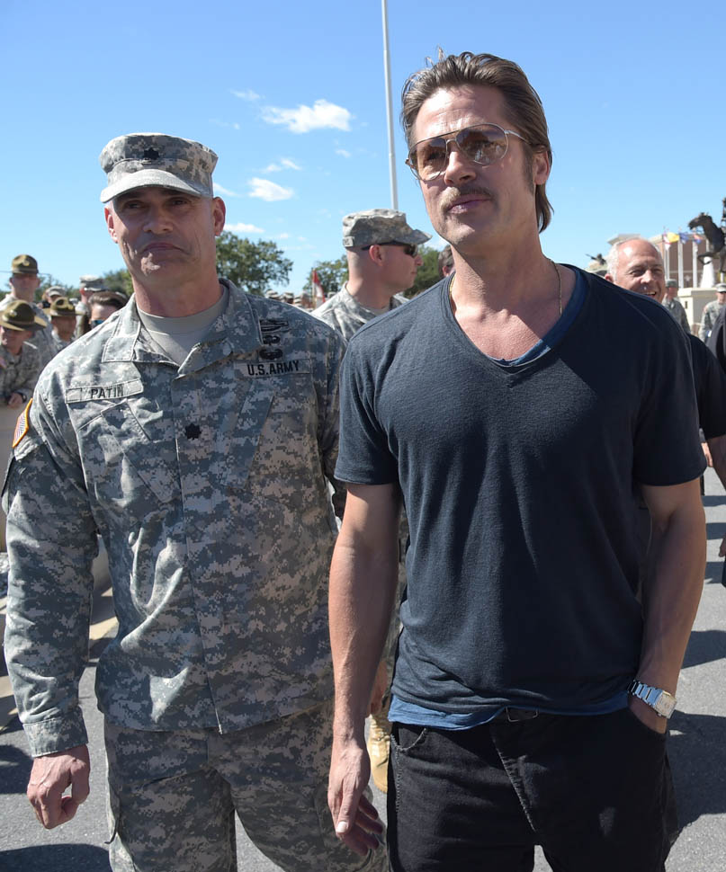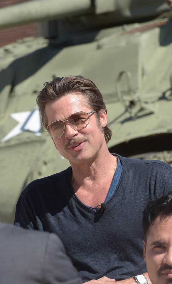 Brad Pitt and the cast of Fury spent yesterday screening Fury for veterans and servicemen in Fort Benning Georgia. Extra also released Brad’s red carpet interview from the premiere in Washington the night before. The reporter was Jerry Penacoli who’s always had a good relationship with Angelina Jolie. Which is why he was probably able to get a lot more personal than is normally allowed in these situations with celebrities. And probably why Brad decided to reveal more than he normally does in these situations, discussing how it feels now that he can call the Jolie his “wife”. And George Clooney comes up too. Click here to watch.