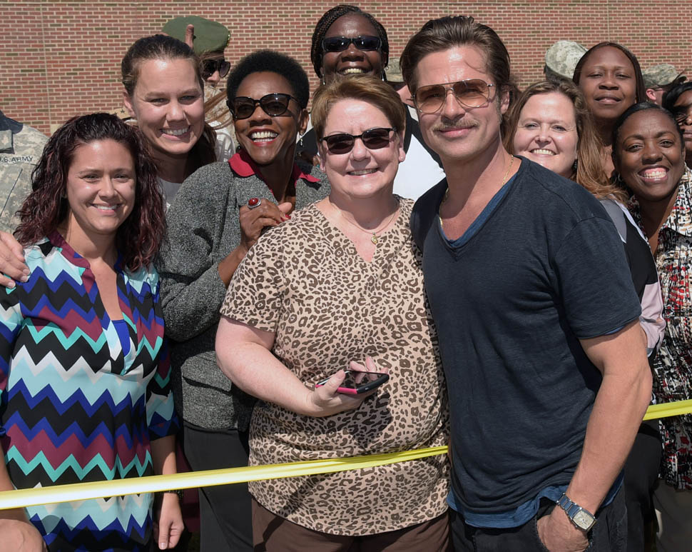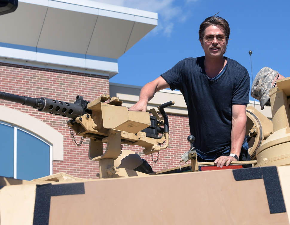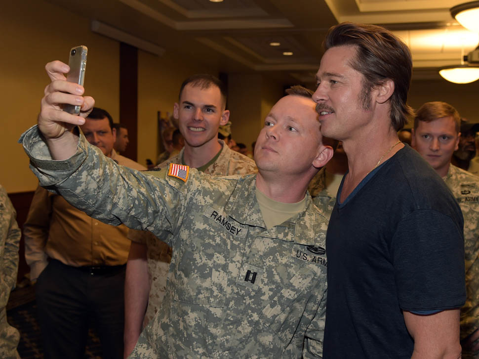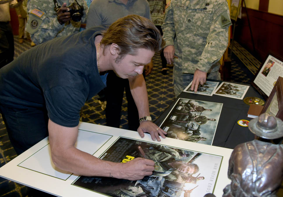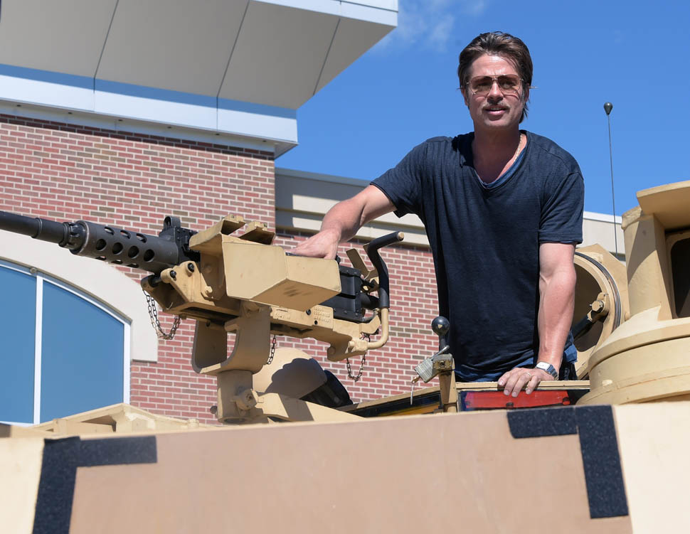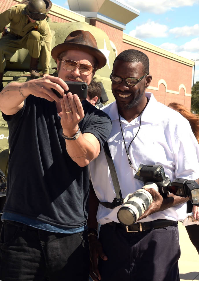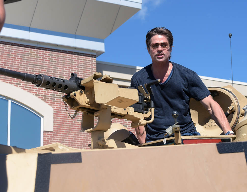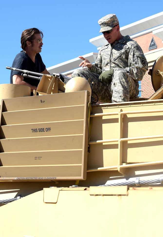 Brad Pitt and the cast of Fury spent yesterday screening Fury for veterans and servicemen in Fort Benning Georgia. Extra also released Brad’s red carpet interview from the premiere in Washington the night before. The reporter was Jerry Penacoli who’s always had a good relationship with Angelina Jolie. Which is why he was probably able to get a lot more personal than is normally allowed in these situations with celebrities. And probably why Brad decided to reveal more than he normally does in these situations, discussing how it feels now that he can call the Jolie his “wife”. And George Clooney comes up too. Click here to watch.