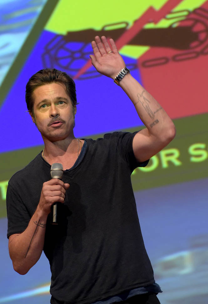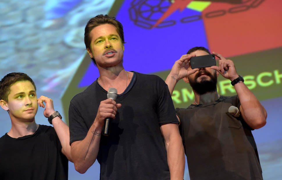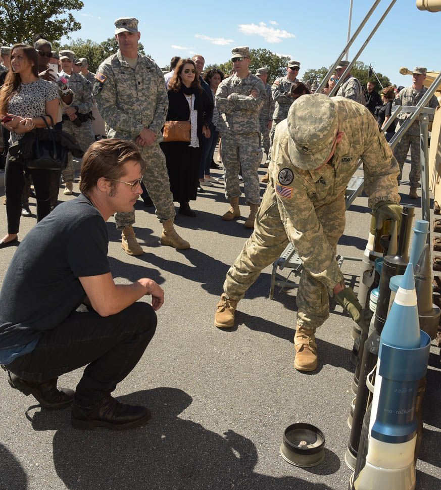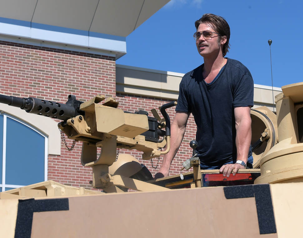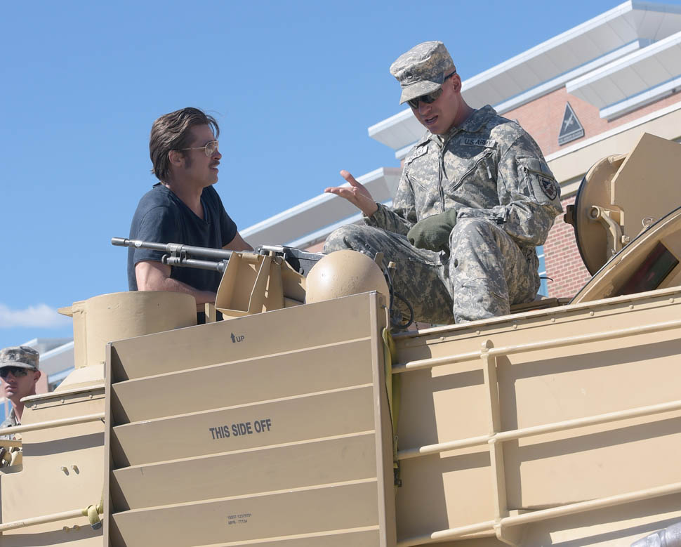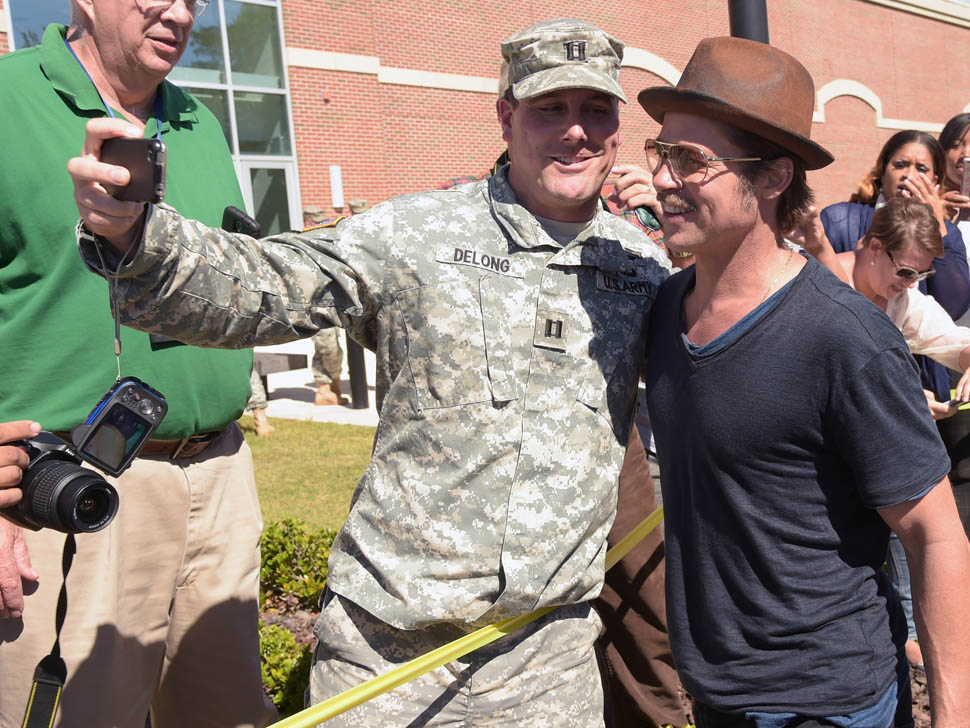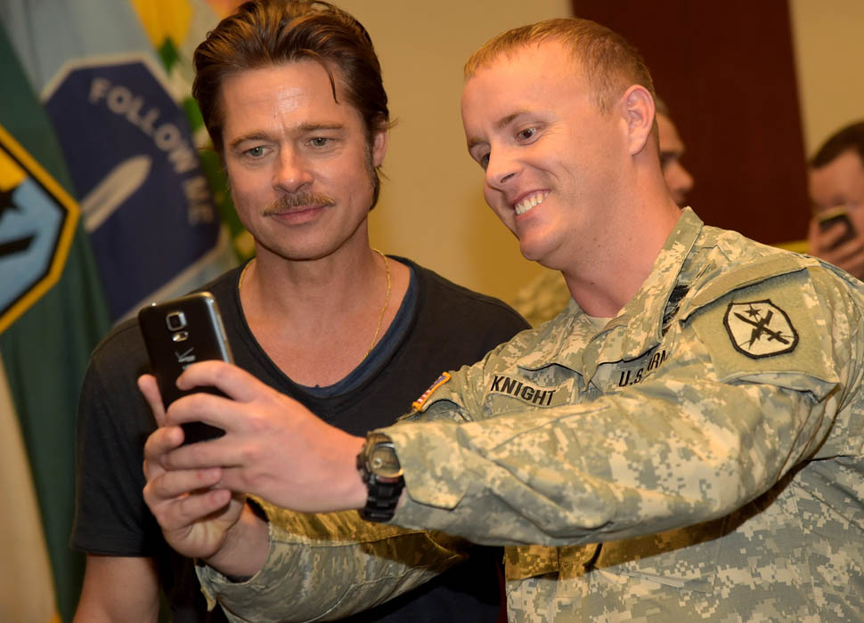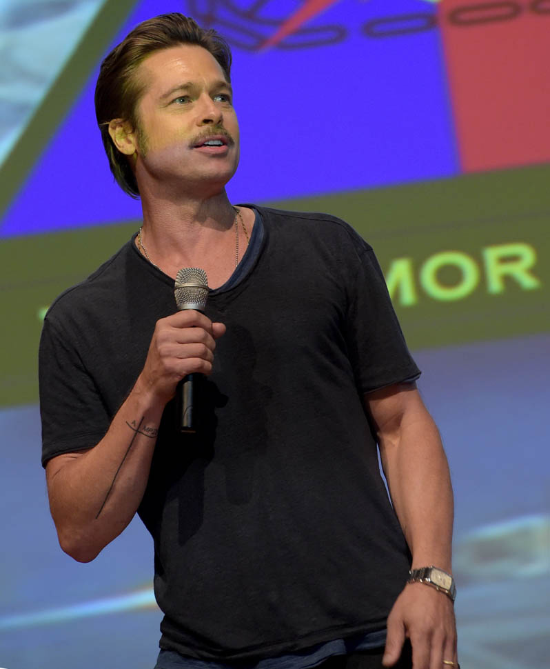 Brad Pitt and the cast of Fury spent yesterday screening Fury for veterans and servicemen in Fort Benning Georgia. Extra also released Brad’s red carpet interview from the premiere in Washington the night before. The reporter was Jerry Penacoli who’s always had a good relationship with Angelina Jolie. Which is why he was probably able to get a lot more personal than is normally allowed in these situations with celebrities. And probably why Brad decided to reveal more than he normally does in these situations, discussing how it feels now that he can call the Jolie his “wife”. And George Clooney comes up too. Click here to watch.