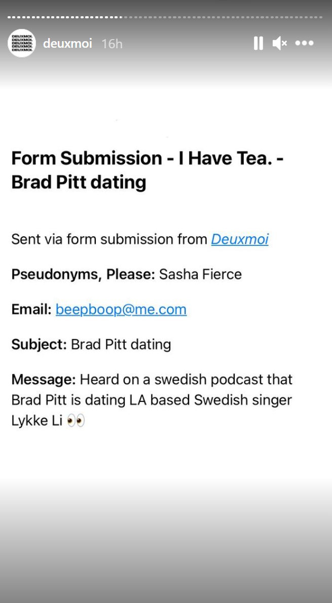 So there’s a rumour that might start picking up about who Brad Pitt could be dating. The origin is DeuxMoi, where so much gossip originates these days, some of it checks out and some of it never does. For those who are unfamiliar, DeuxMoi makes it clear that they do not follow up on their submissions. Whatever gets sent in is posted, without verification. So anyone can send in anything, and that happens often. But there have been occasions where the information checks out. With that in mind, here’s what turned up on DeuxMoi yesterday: