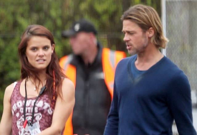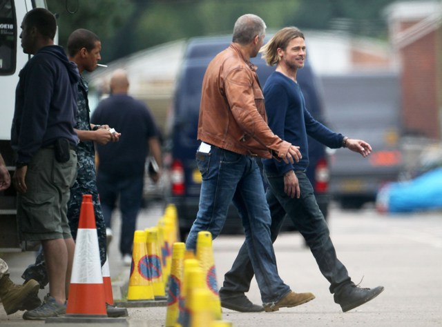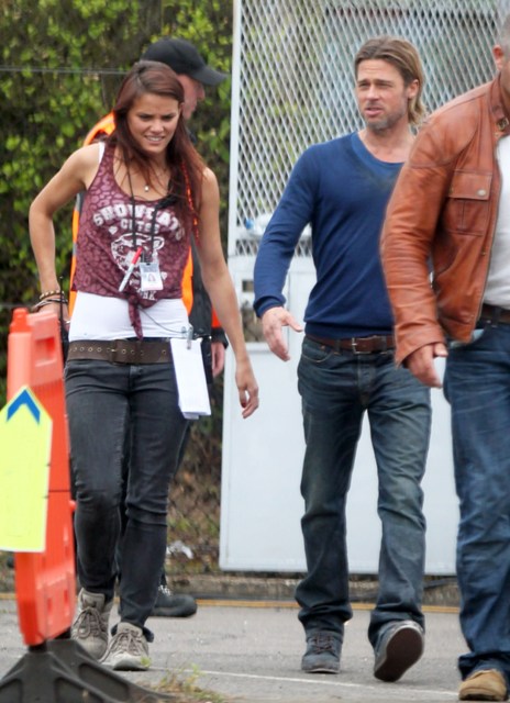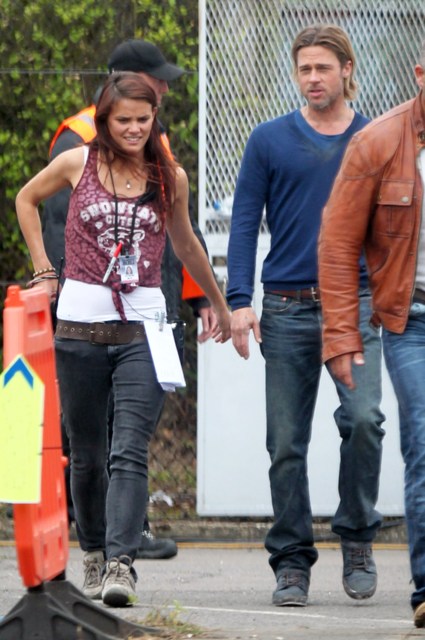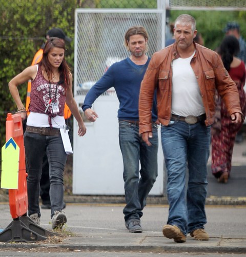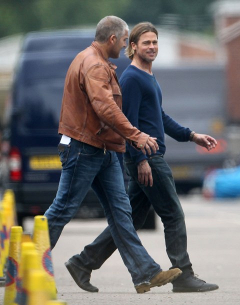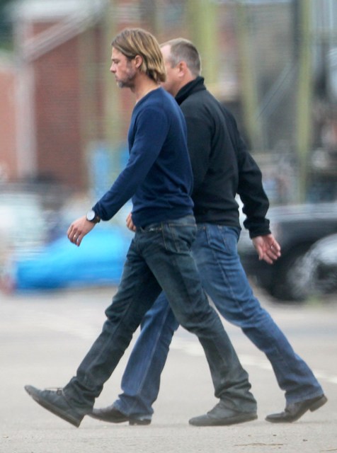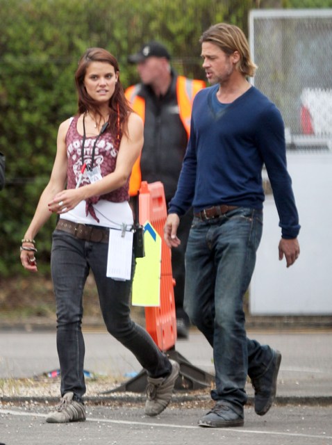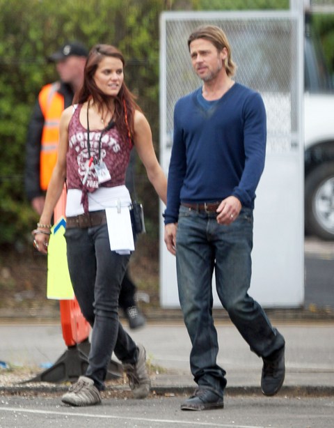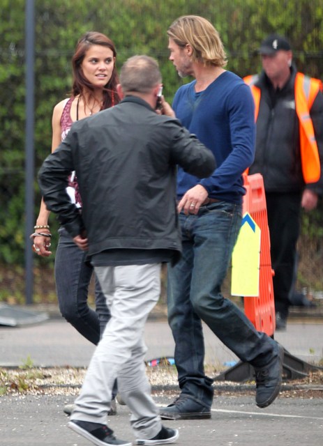 Brad Pitt is in Rome or England (the photo agency can’t make up its mind about the location but does claim to be able to read Brad’s behaviour) continuing to shoot World War Z after spending a few weeks in production in Malta in which he appeared to only wear one outfit. One long scene? I like the look of him in these jeans. As for that girl...