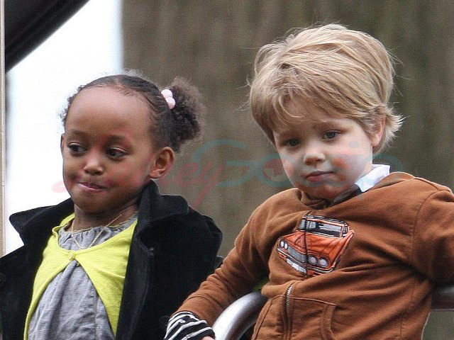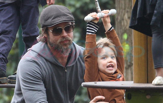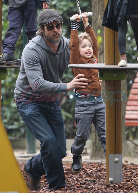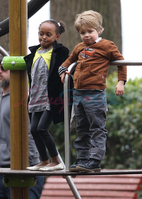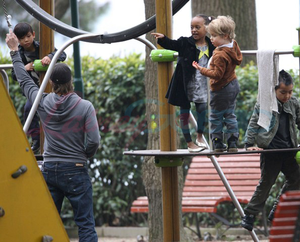 Brad Pitt took his 4 oldest kids to the playground the other day while Angelina Jolie was working in Venice on Saturday. The Chosen One is wearing doc martens. Amazing. We were just talking yesterday at the airport (totally unrelated) about how people used to get rolled for their docs back in the day. Remember? I wore them with my school uniform and a kilt hiked up to just under my ass. Though I have urges for Marion Cotillard and a few others, I am not a lesbian. But this won’t stop the f-cking eejit MiniVans out there from labelling it on Shiloh…and getting a two finger f-ck you from her sister Miss Zahara.