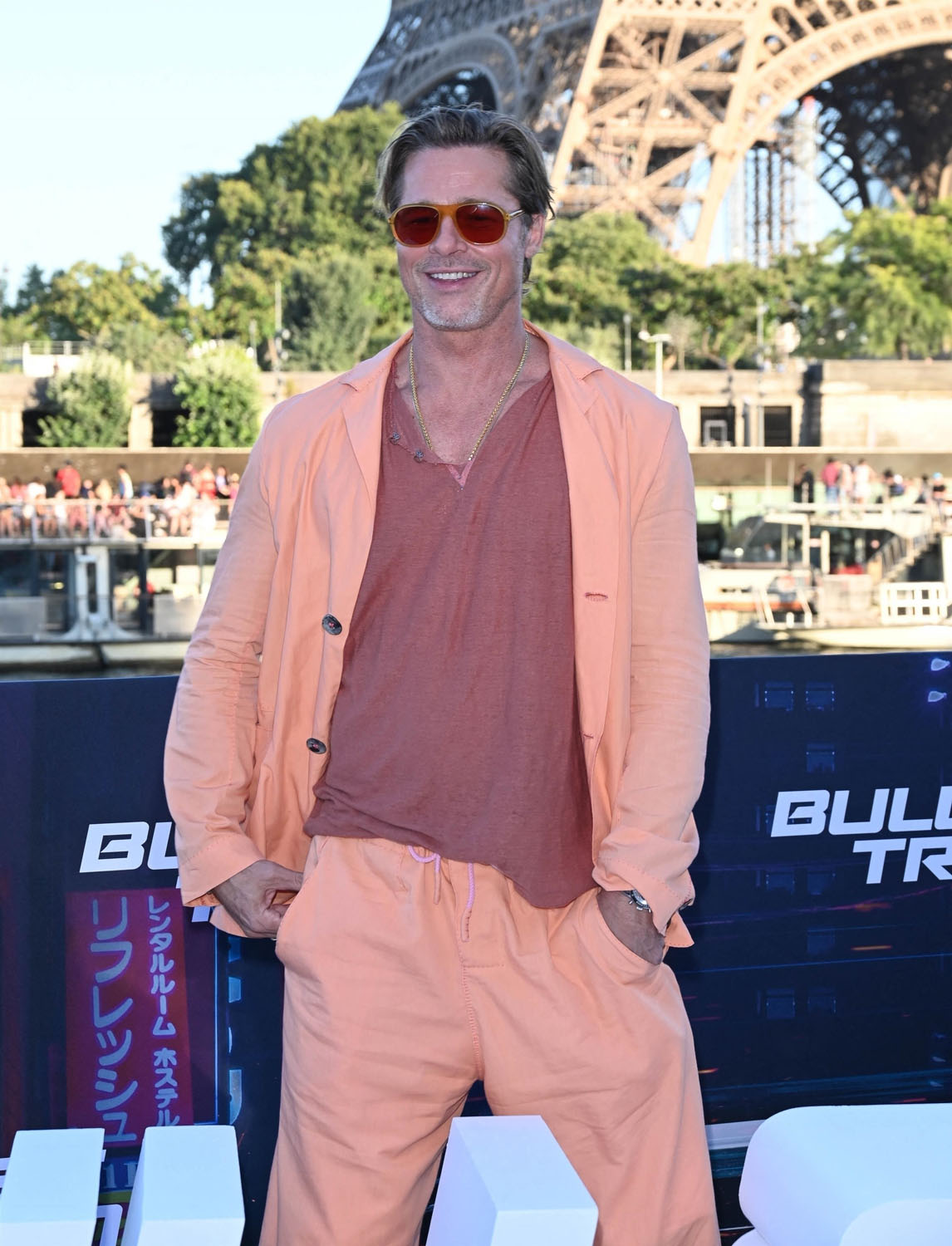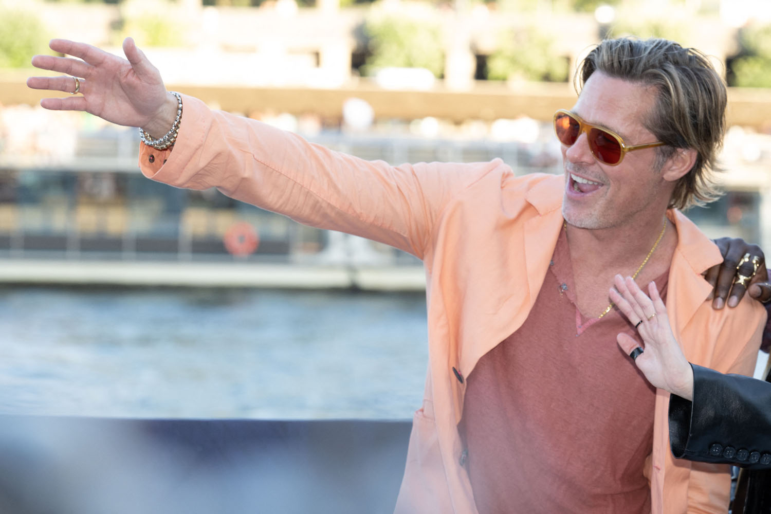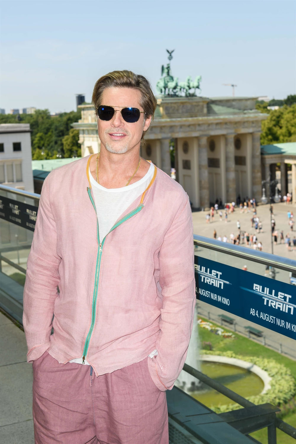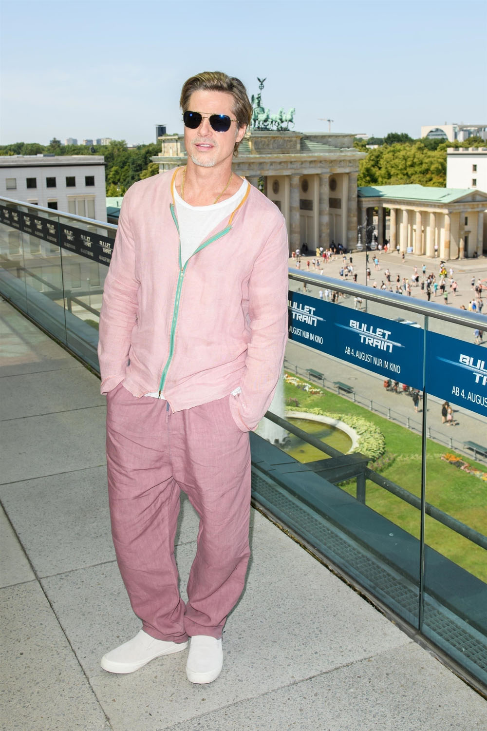 Brad Pitt is currently promoting Bullet Train and the press tour is in Europe right now. On the weekend he showed up in Paris in a peach coloured pantsuit. Today he’s in Berlin and he’s wearing pink. He does look good. He’s cut his hair a bit, he has a tan – he’s bringing the full force of his Brad Pitt-ness to this promotional push. And…that also works as a distraction for his other sh-t.