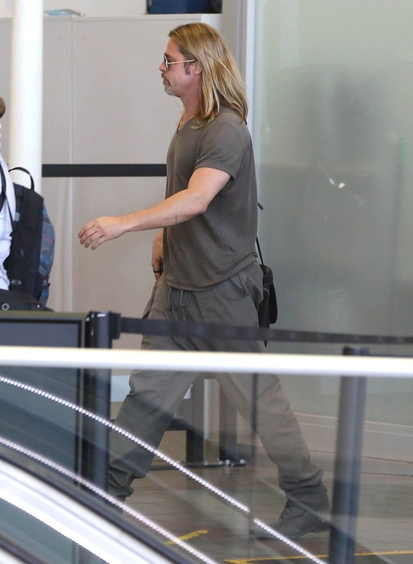 Brad Pitt's hair. Like before it was grazing his shoulders. Now though, as you can see, it's long enough so that he can, you know, if you have it or you've had it, flip it back behind your shoulders with your hand. Are you into it? Brad's looks can be polarising. For the most part, I'm usually pro-Pitt. But this? This I can't get down with. And I'm pretty sure it's universally unappealing, even for the most hardcore Brangelunatic.