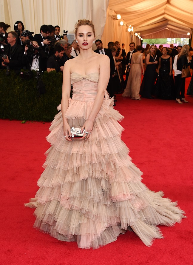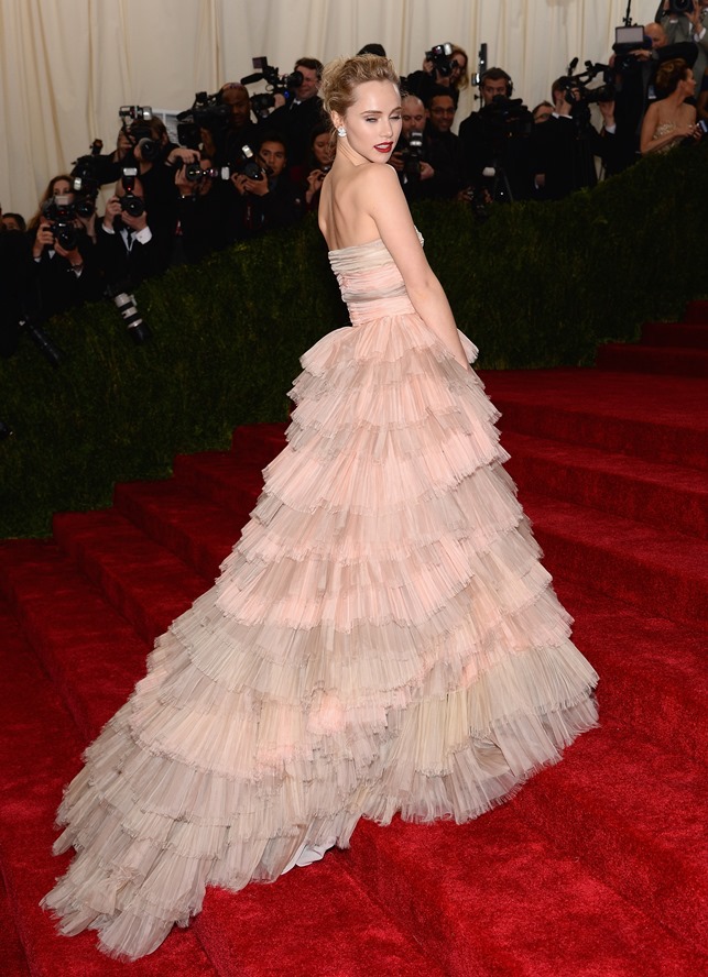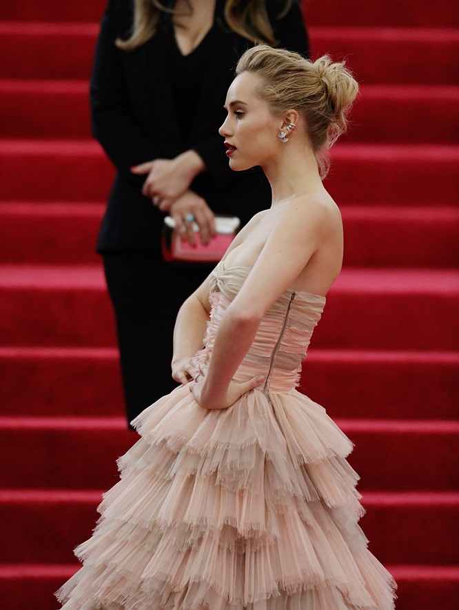 Coop’s girlfriend, Suki Waterhouse, was there too, angling her arms forward, model-styles, so as to generate maximum arm thinness. Happily, her hair has improved. But this dress, Burberry, is a f-cking mess, well below the label’s usual standard. Then again, tiered ruffles don’t do it for me.