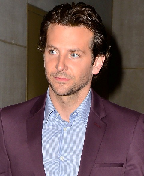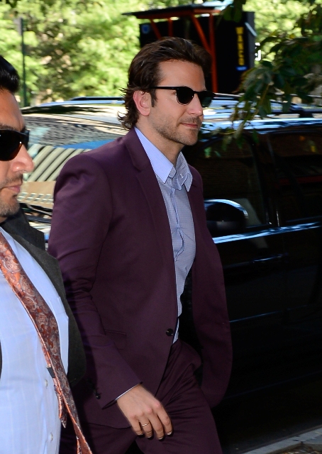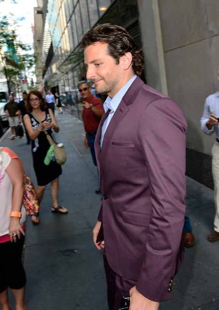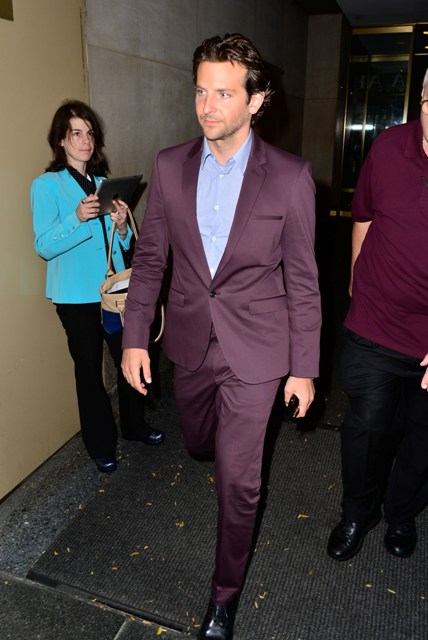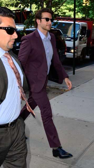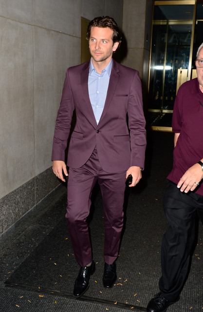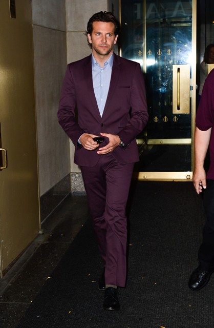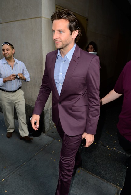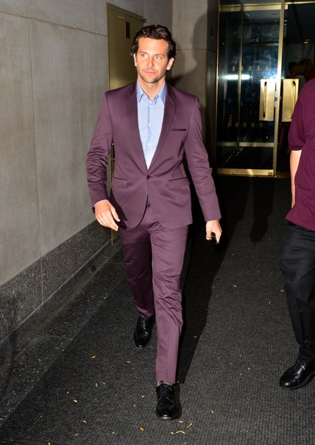 Here’s Bradley Cooper not really doing a great job wearing eggplant today while in New York.