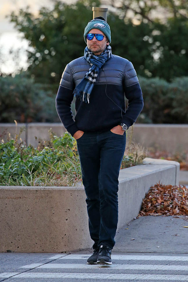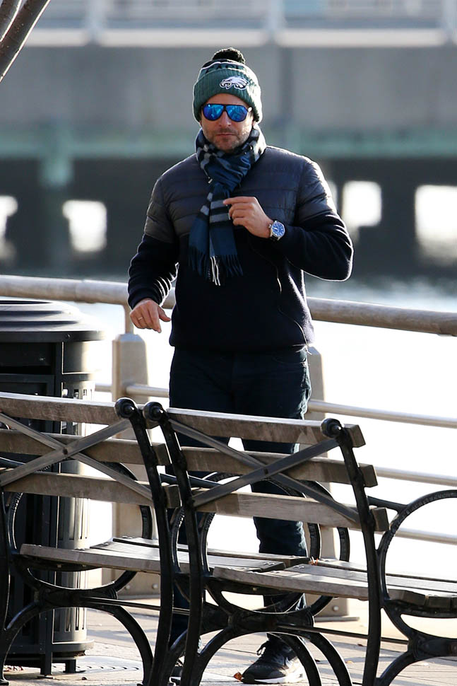 Bradley Cooper went for a walk in New York yesterday. The paps said he was “enjoying the sunset”. Check him out, like he’s in an Asian karaoke video, walking along, listening to his feelings? You ever been to an Asian karaoke? To me, they’re the only ones worth going to for the private rooms, the song selection, and the snack options. Anyway, back in the day, they’d give you Peter Cetera over the visuals of people ambling along the beach, with birds flying in the background.