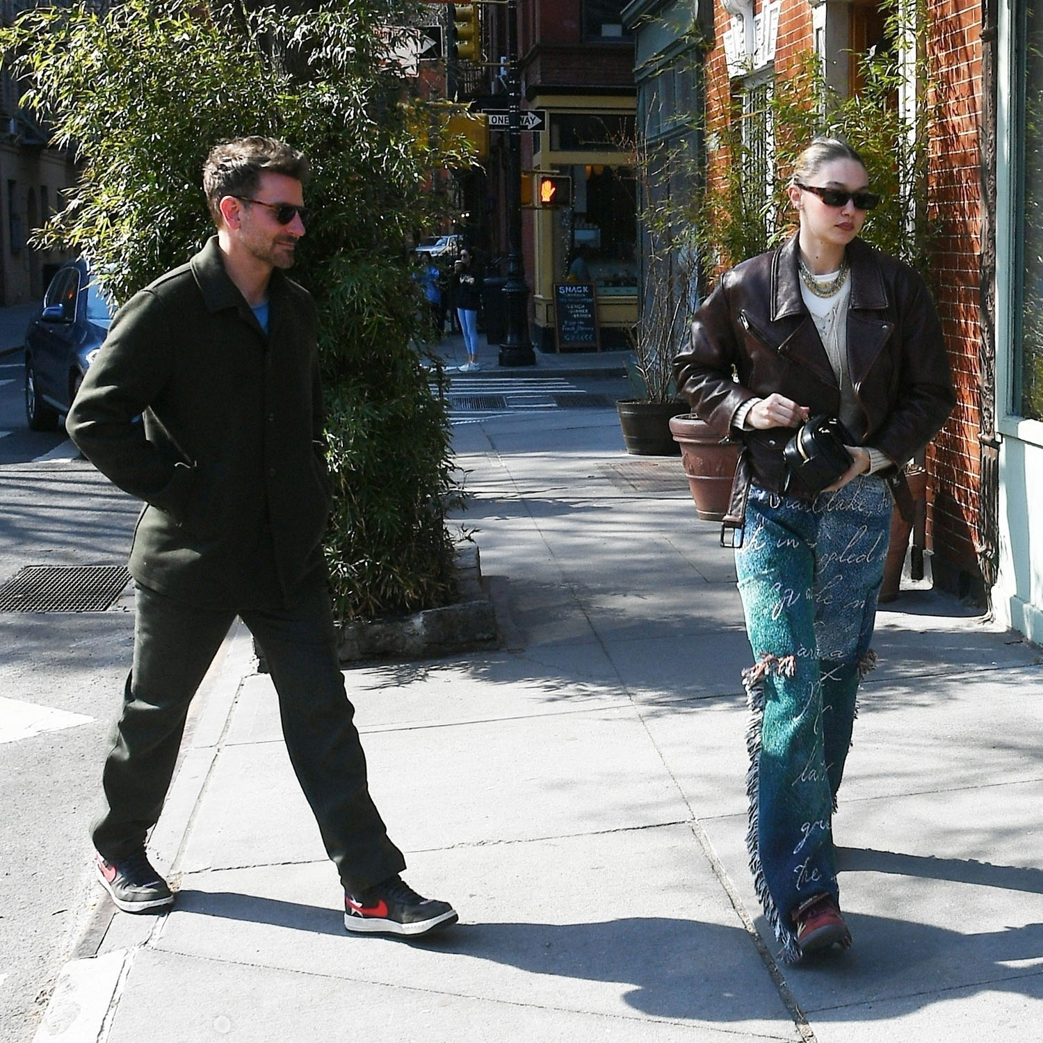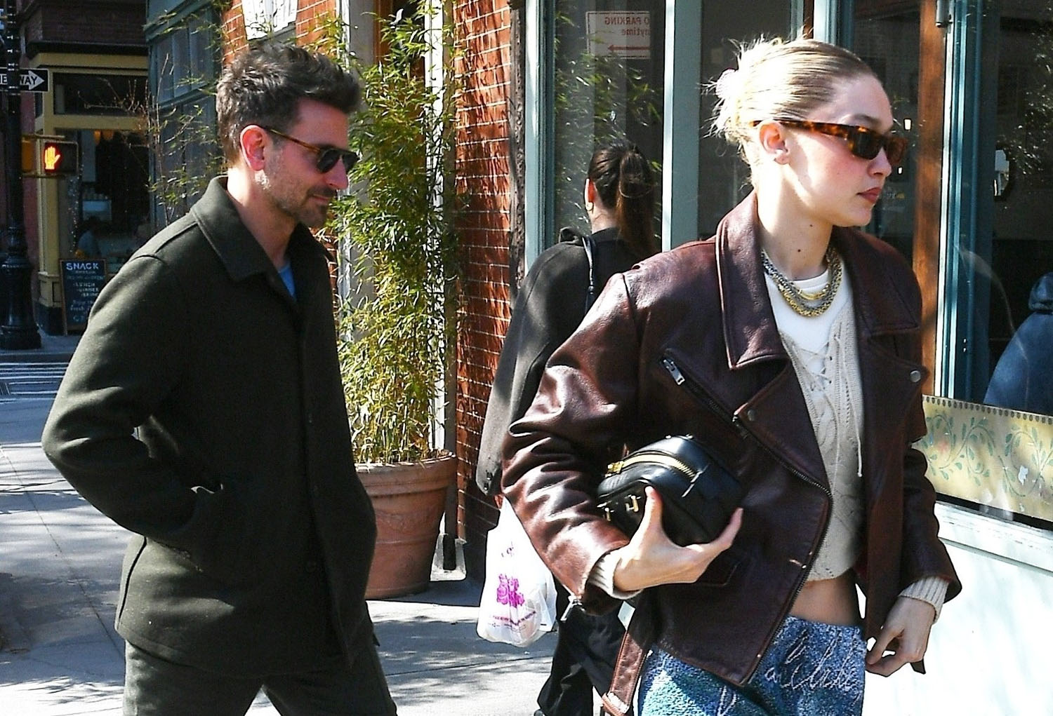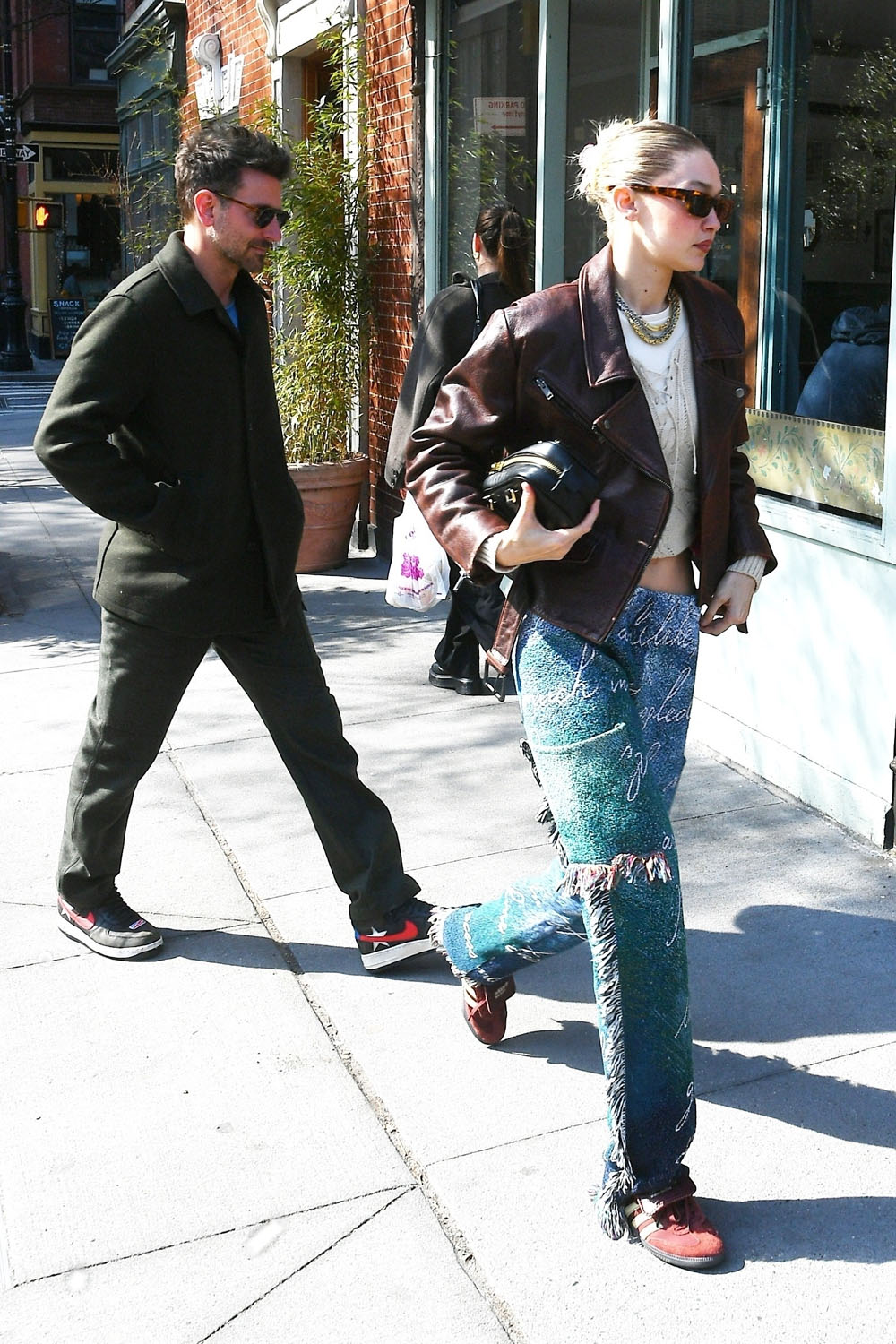 So here they are in New York this week, out for lunch with a friend, and there was some PDA and nobody’s booking it down an alley when the car pulls up. Which, of course, is totally unlike what it was when Gigi was allegedly dating Bradley’s FRIEND, Leonardo DiCaprio.