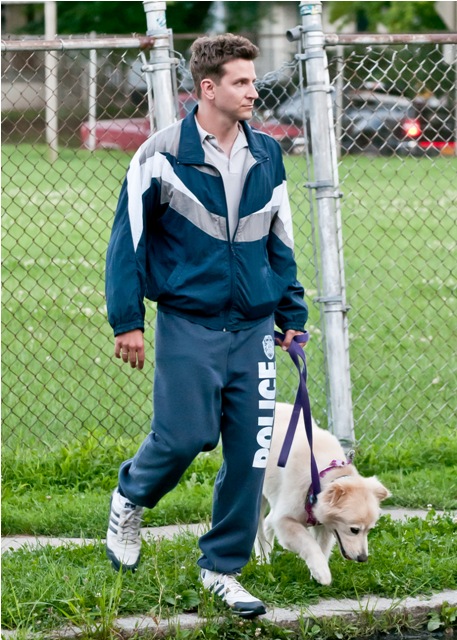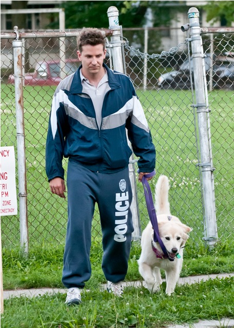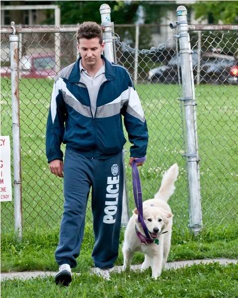 Coop is in Schenectady, NY, on a break with his dog, shooting The Place Beyond The Pines with Ryan Gosling. As you can see, both actors have been costumed rather...provincially... for their parts. Gosling’s hair is now bleached, he’s fake tats all over his face, and rides around in a jumpsuit, on the outside very much a small town lowlife to Bradley’s stereotypical douchebag of a cop. How do I know he’s a douchebag? I don’t. He could be playing a dork instead. But anyone wearing that track suit in a movie - it’s either douchebag or dork, it’s never anything more attractive. And I have never been less attracted to Bradley Cooper than I am today. Even with his dog. Think about how potent the repellent on that track suit must be for me to see him with a dog and want to look away.