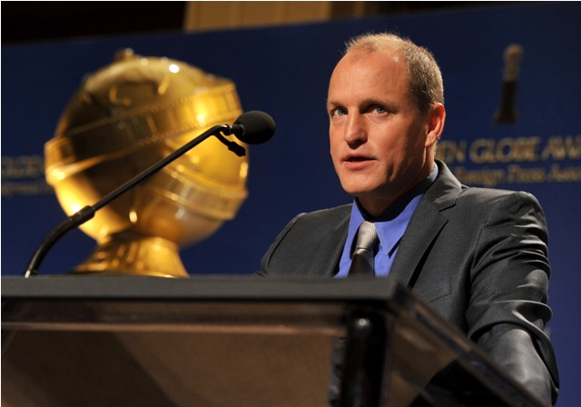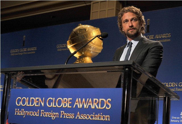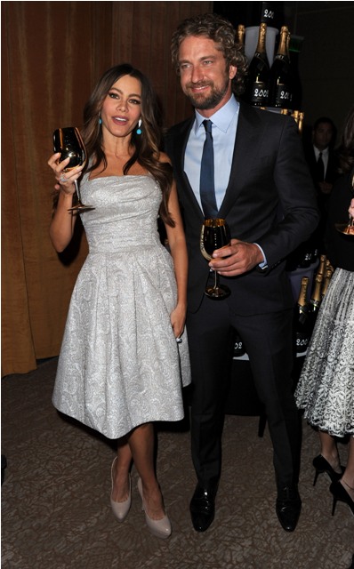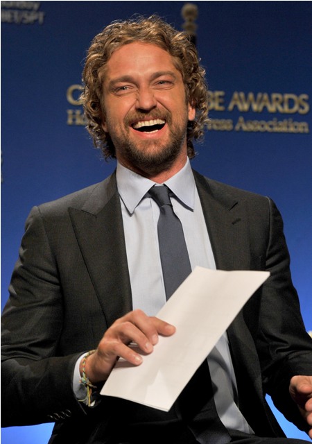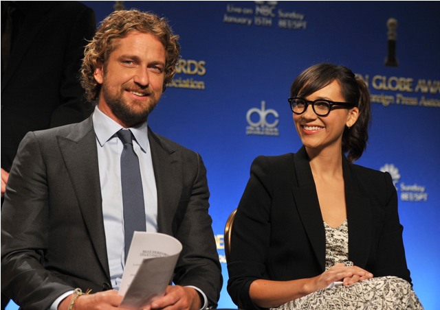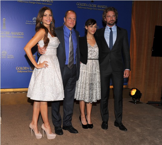 Attached - Sofia Vergara, Rashida Jones, Woody Harrelson, and Spittle Gerard Butler being gross at the Golden Globe nominations announcement this morning.