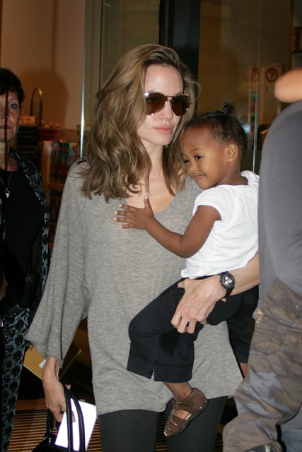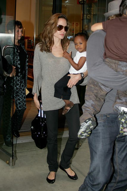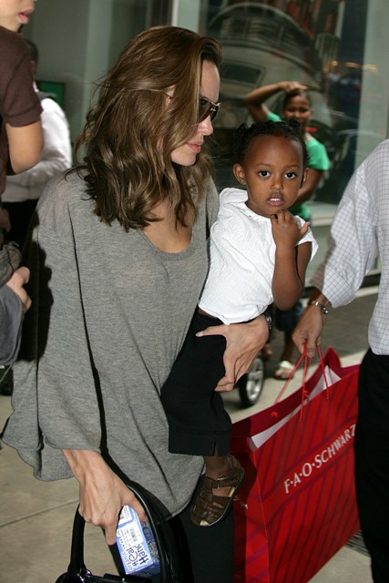 Here they are back in NYC – Brad picking up Maddox from school (cutest!) and Angelina taking Miss Zahara shopping for toys.