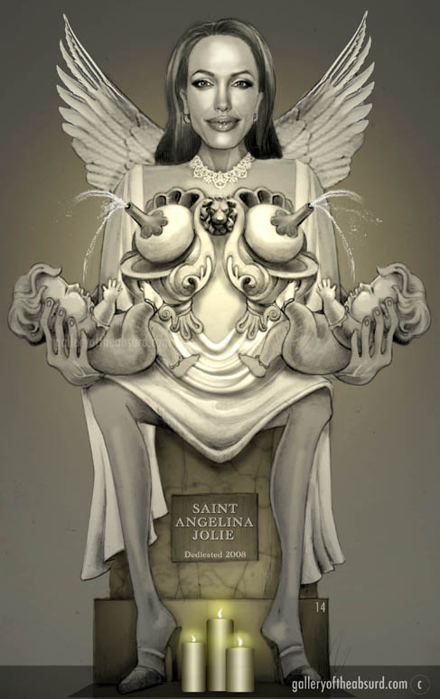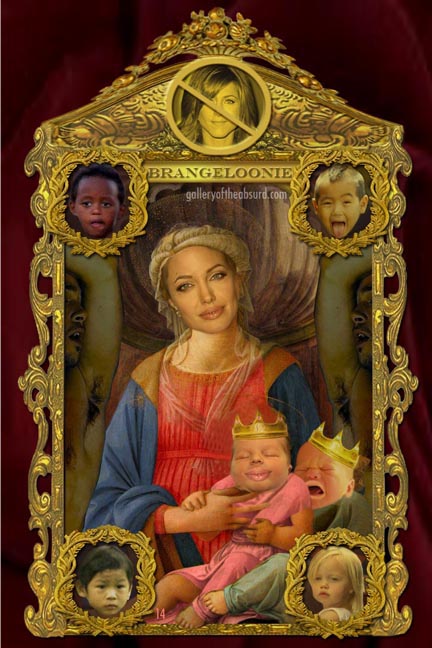 Attached – Gallery of the Absurd’s hilarious tribute to the crazy fans of the Brange. And also her most recent masterpiece inspired by Angelina Earth Mother. For more click “Brangelina” from her home page.
