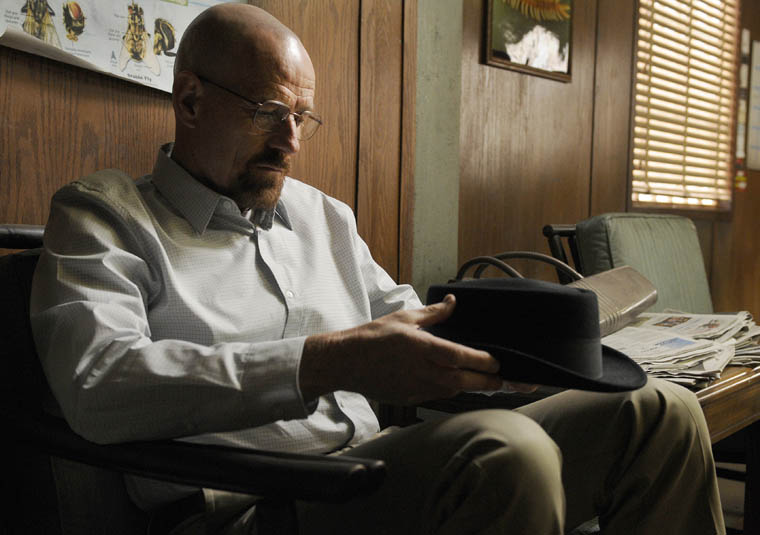 Walt is lost in thought, noticing a loose thread on his hat. Heisenberg is unraveling.