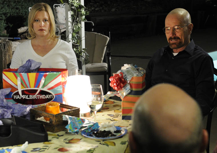 Skyler sets up a birthday just special enough that Walt won’t complain —she’s invited Hank and Marie, cooked dinner and baked Walt’s requested chocolate cake. He can’t be angry with her, but he can’t be happy either. Skyler keeps him in the middle, where he always hated to be.