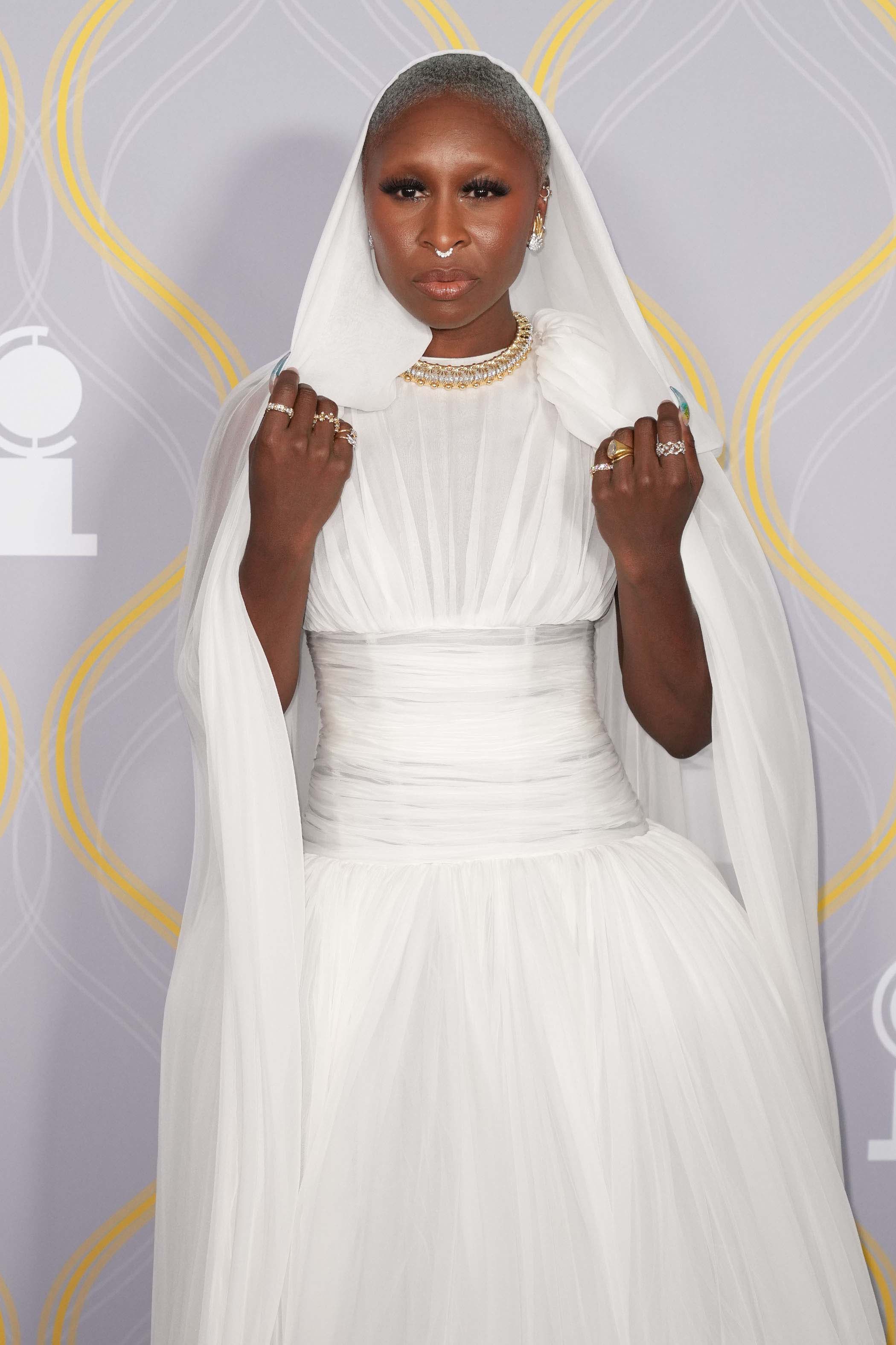 Understated is never the theme of the Tonys, especially not when Broadway was celebrating its return after two years of COVID shutdowns. So there were a lot of great looks last night and we’ll showcase some of them here, starting with Cynthia Erivo, my personal favourite. Because I’ve always had a thing for a red carpet hooded cloak. And this is one of the most spectacular award show hooded cloaks I’ve ever seen.