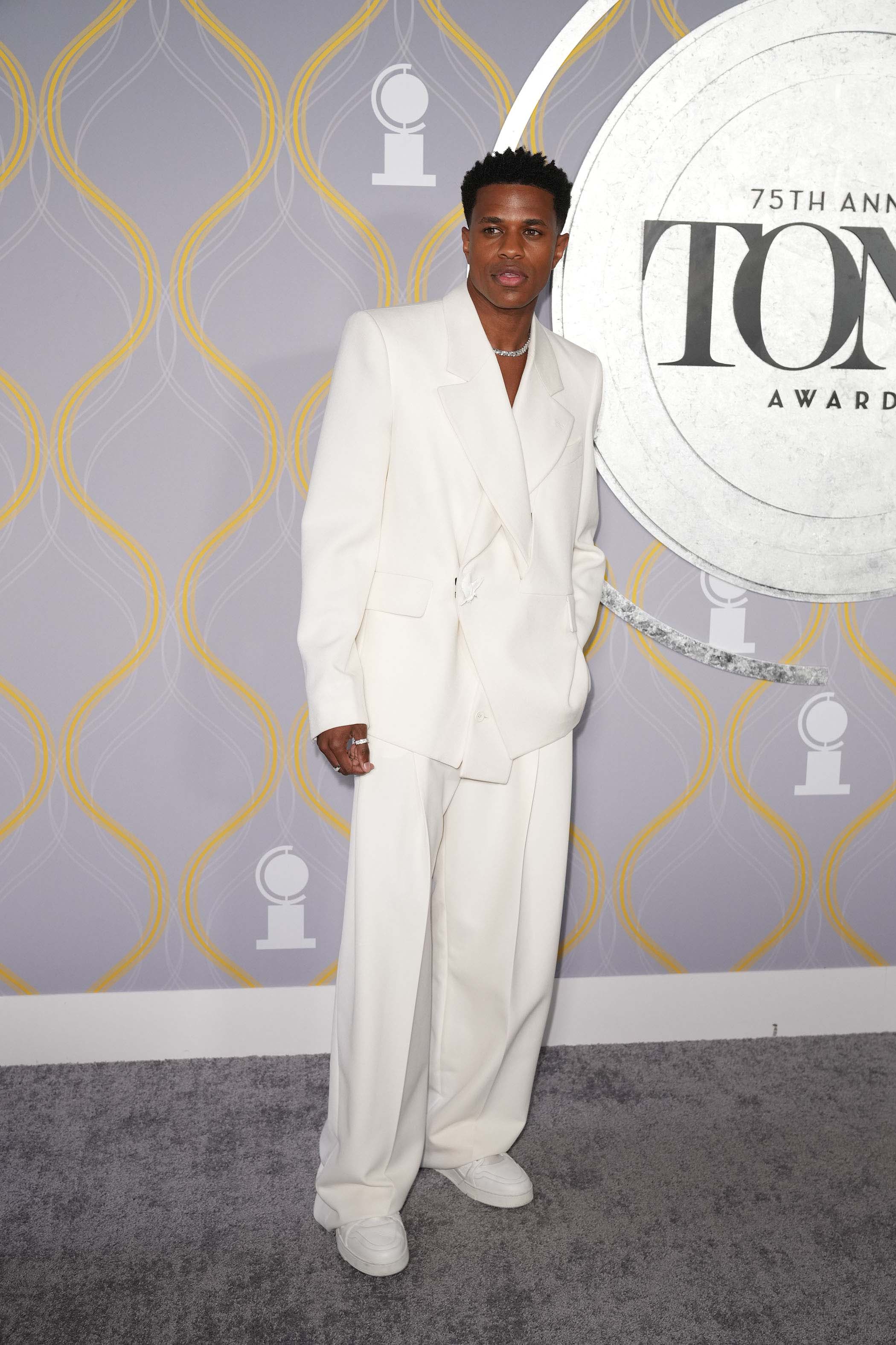 Staying with white, on the men’s side, Jeremy Pope in a loose-fitting Louis Vuitton suit with sneakers is exactly right. Bigger pants for men on the red carpet now, we’re seeing more of it.