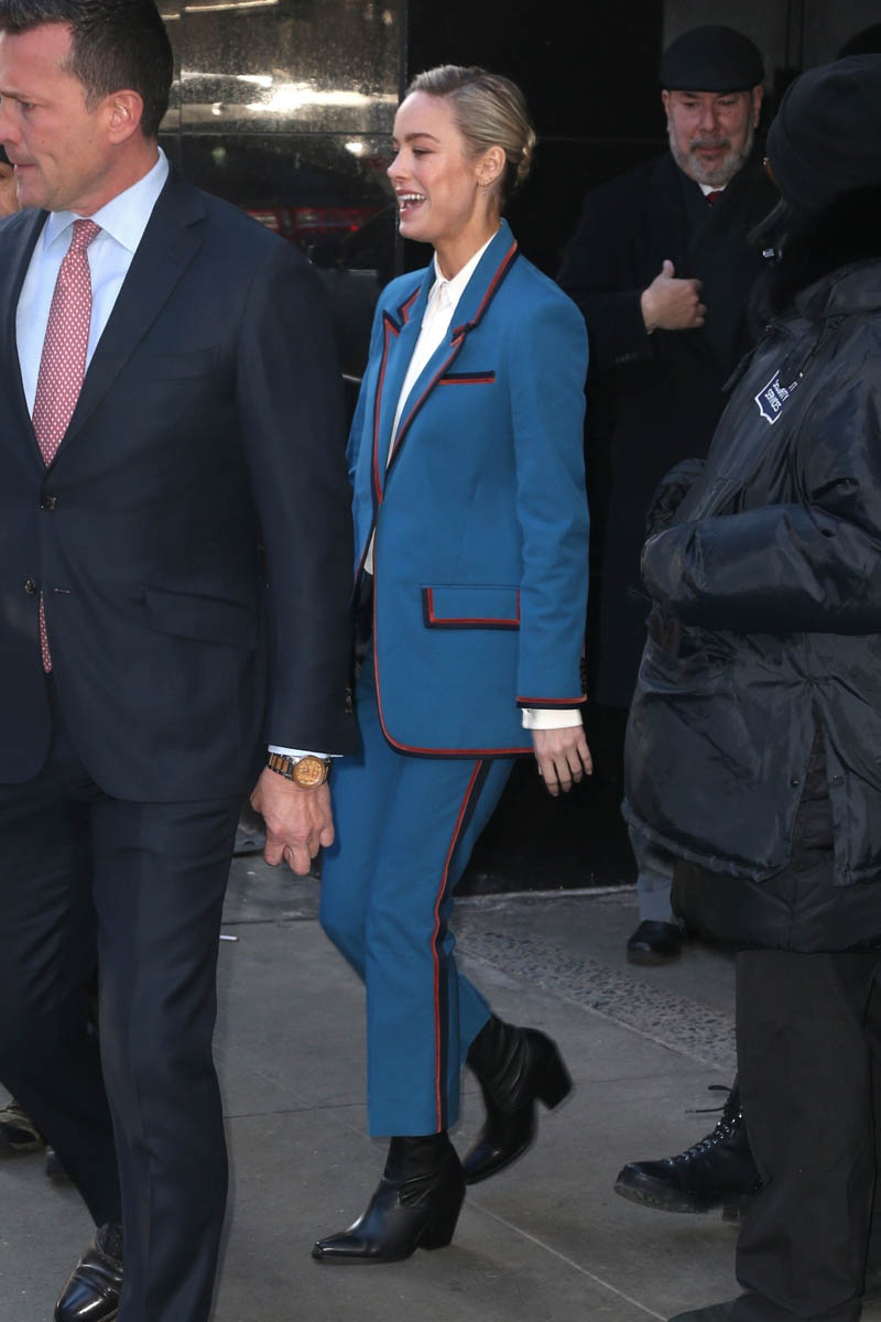 Of course the Outfit of the Week is going to be Captain Marvel related today. Outfits, plural though! Because I can’t decide between Brie Larson in this blue suit with red trim which… what are the colours you see here?
