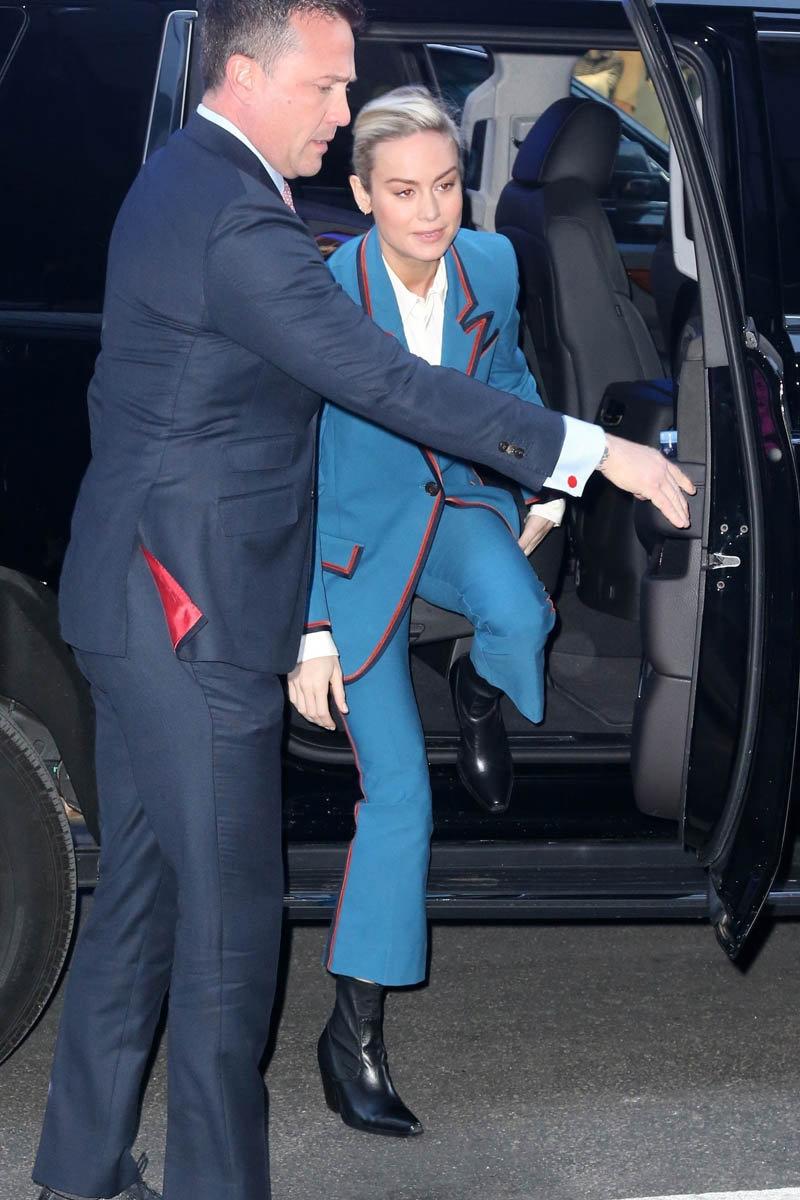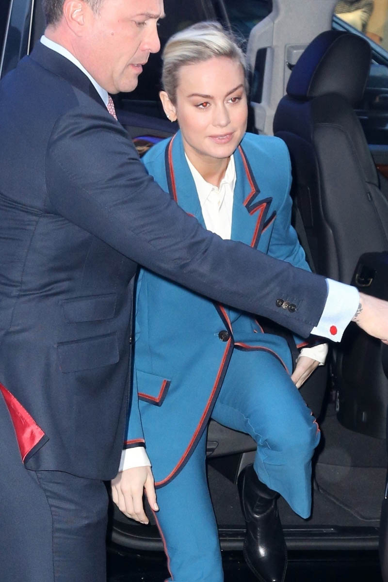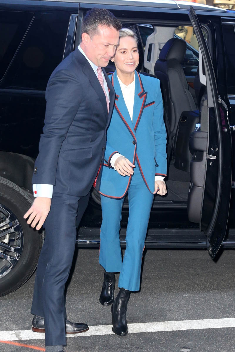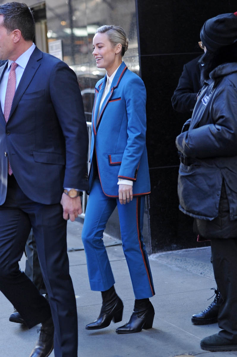 Of course the Outfit of the Week is going to be Captain Marvel related today. Outfits, plural though! Because I can’t decide between Brie Larson in this blue suit with red trim which… what are the colours you see here?