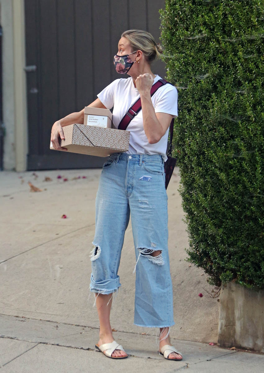 Keeping with the white and denim theme, here’s Brie Larson picking up some boxes from her stylist, Samantha McMillan. Looks like there’s definitely a pair of shoes in that haul. Wonder if this is for an upcoming appearance somewhere. I don’t remember if Brie’s promoting any projects in the next while but she did launch her YouTube channel recently so, I dunno, maybe it’s for that? Or, you know, maybe work and social media has nothing to do with it. Maybe she just wants some fresh gear to go along with the cute gear she already has. Like this white tee and these jeans. I know they might be an adventurous step for some of you. And I’m not saying you should throw out your skinny jeans. I’m just saying… sometimes your calves need a break. I’ve given my calves a break for over a year now. The skinny jeans are still in the closet. But my calves are getting some rest.