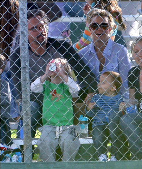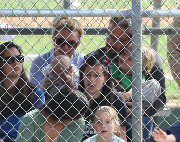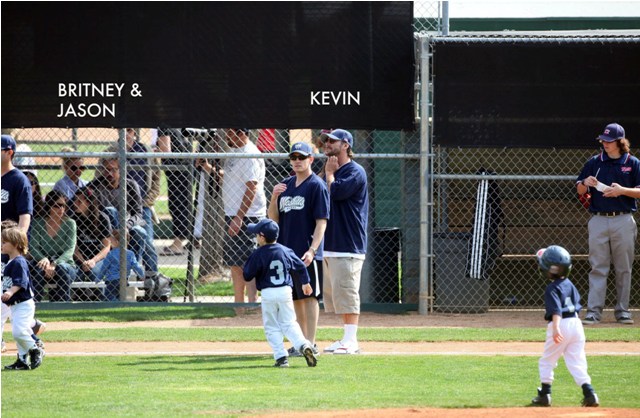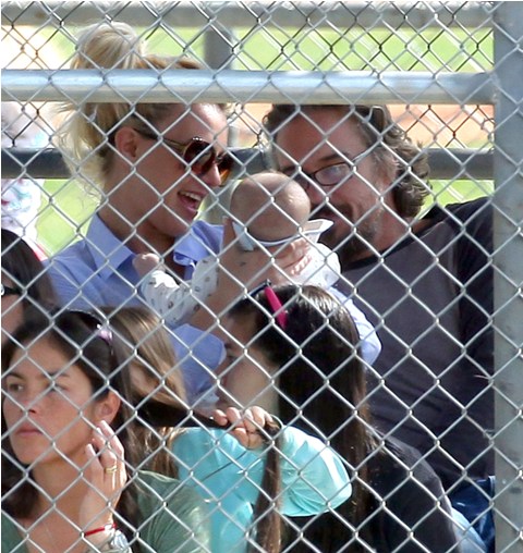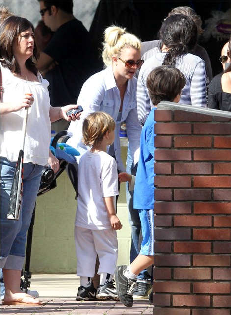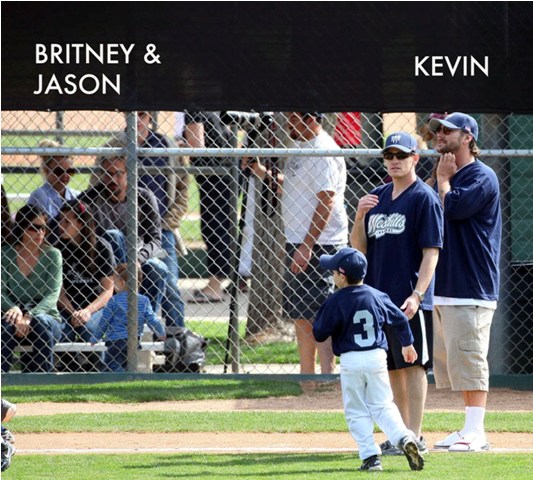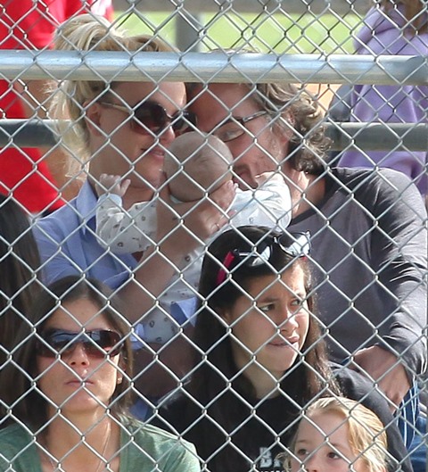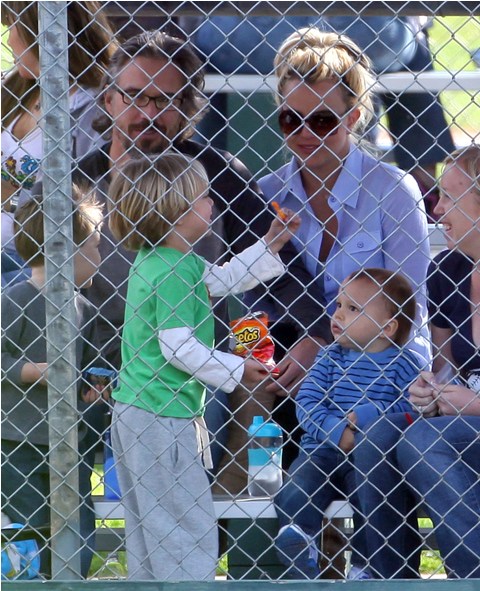 One of Britney’s kids (I still can’t tell them apart, and thank you in advance to all you know-it-alls who are about to tell me) had a little league game this weekend. She and her boyfriend Jason Trawick showed up to watch him. Kevin Federline and his gf Victoria Prince were also there. Britney sat near Victoria and the two were observed chatting amiably. So it’s all good in the trailer park. Like Fried Chicken is now the model for civilised divorced parenting. She can manage that but not find a pair of leggings without a hole…?