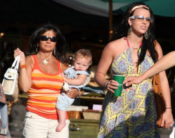Have you seen this??? Taken during the inaugural summer of Federline love, while Britney still had a cute body and a loyal fanbase, it is a heartbreaking glimpse into the reverberating void that is her brain, and also illustrates perfectly why home videos are a publicist"s worst nightmare. Can you believe that once upon time, Britney Spears was hailed as the heir to Madonna in every respect? Mediocre talent supported by brilliant packaging and even more brilliant business sense? Don’t lie. Way back, when America"s pop princess was the top of the mountain, you believed it too. In fact, her jaw dropping stupidity was not a subject of debate until the Vegas marriage incident, regarded by most as the beginning of the end, and finally slamdunk evidence that no, Britney was not and would never be as smart as Madge. EV-ER. But it still took us years to figure it out, y"all. And THAT is the power of a well devised media strategy. A media strategy that has since been shot to sh*t, replaced by the cold hard truth: Britney is as dumb as it gets. However, as I always say - fashion not function. Which is why I"m so happy to see Britney looking lovelier by the day, with her baby and her mamma, still rockin" the black locks, skin totally clear, better than she"s been in many, many months. Now if I remember correctly, she also got progressively cuter through her first pregnancy too. Except of course last year she was blonde. And a Kabbalist. With no boo boos. Though her little boo boo is really undeniably cute, non? Thank Goddess he was spared his father"s buggy, too far apart eyes. I know you know exactly what I mean. And yes, I"ll see you in hell.