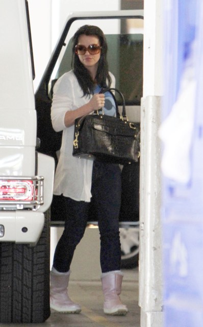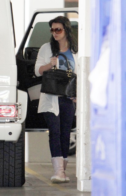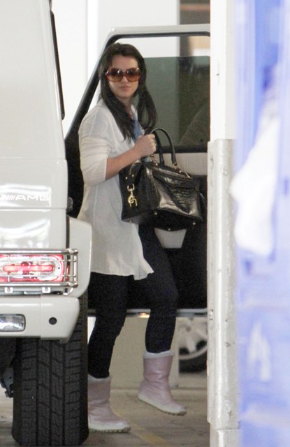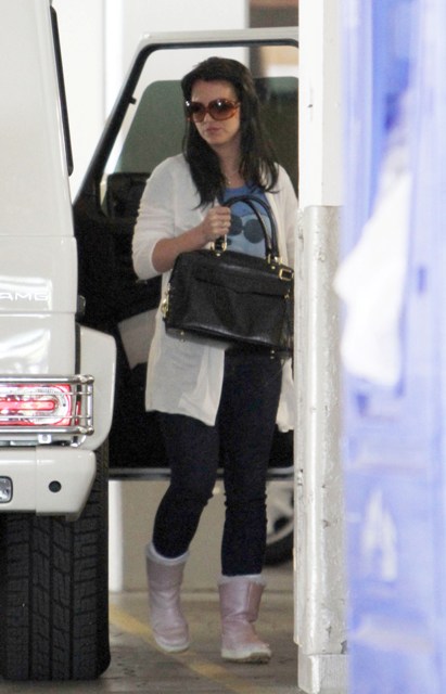 Britney Spears was photographed yesterday at the Mondrian Hotel in West Hollywood with dark hair. Again. As I’ve already noted, Britney un-blonde is trouble. And the timing…