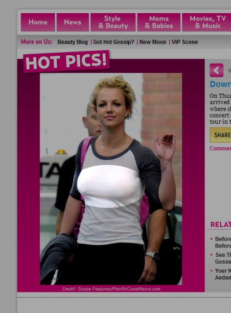But this is the photo that ended up on the Us Magazine website. Can you spot the difference(s)? Fried Chicken nipples were too obscene to be posted without retouching. Me, I find Britney’s nipples less obscene than Tori Spelling’s homewrecking face. Taste is individual.
