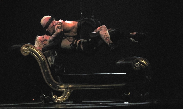 Because while Britney was not the spacey overmedicated robot we saw promoting the album around the release in Europe and on Good Morning America, things could be tighter. The energy is there, but the steps could be more crisp. This will come as the tour progresses. As will her comfort level. Last night she did not engage the audience except for a thank you at the end, probably because she was concentrating on not falling. Then again, Madonna rarely interacts with the audience the way she used to back in the day either. Both have become more guarded over the years. More controlled. I suppose Madge isn’t a bad example to follow.