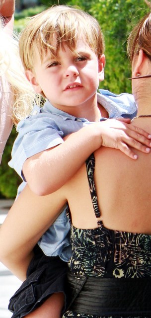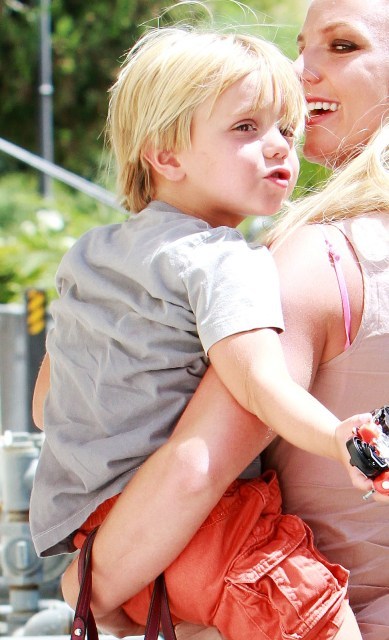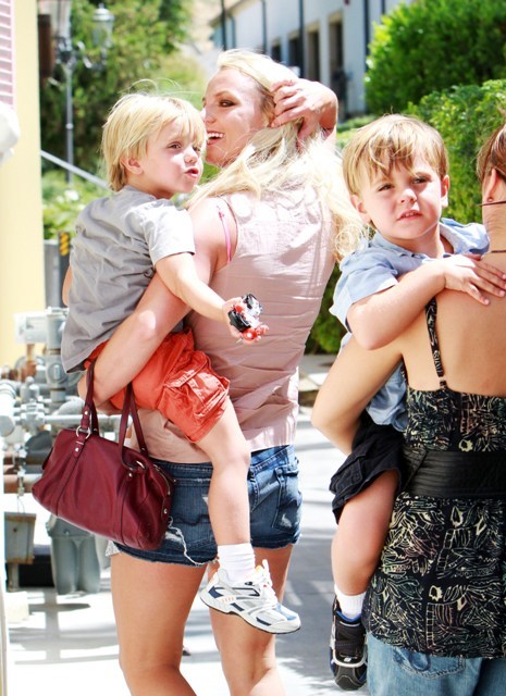 At some point during the day, Britney also hooked up with her kids, took them to Johnny Rockets. You think her children will inherit her dietary preferences? And they STILL look the same – ageless, indistinguishable, what is it about Britney’s boys? Compare to those Beckham boys – every time you see them you can actually count out the inches. But as Duana originally noted, SPF and JJ never seem to grow. Or if you want to get really trippy, maybe it’s because Britney is permanently stuck at a pigtailed 16, Hit Me Baby One More Time.