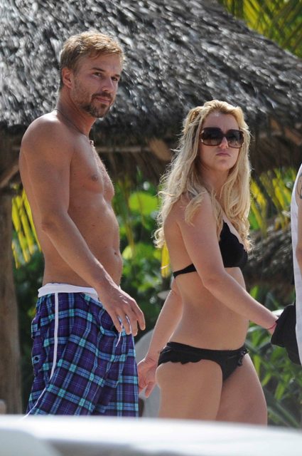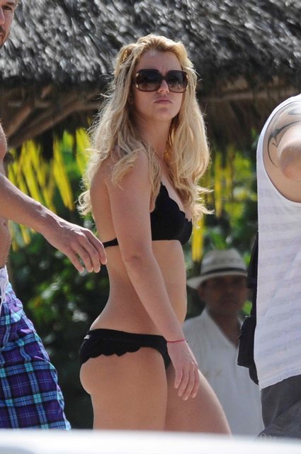 The Chicken Fried Comeback & Milk It is enjoying some down time before her Circus swings Down Under, spotted on Sunday in Mexico with her kids and her man and her dad, fit and tight in a black bikini.