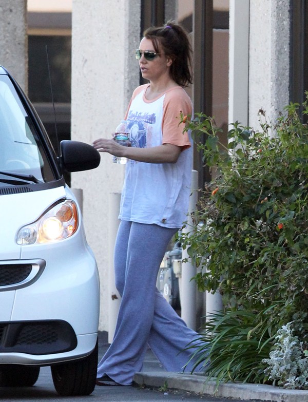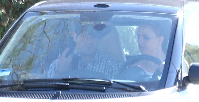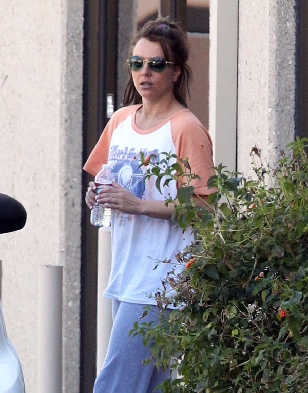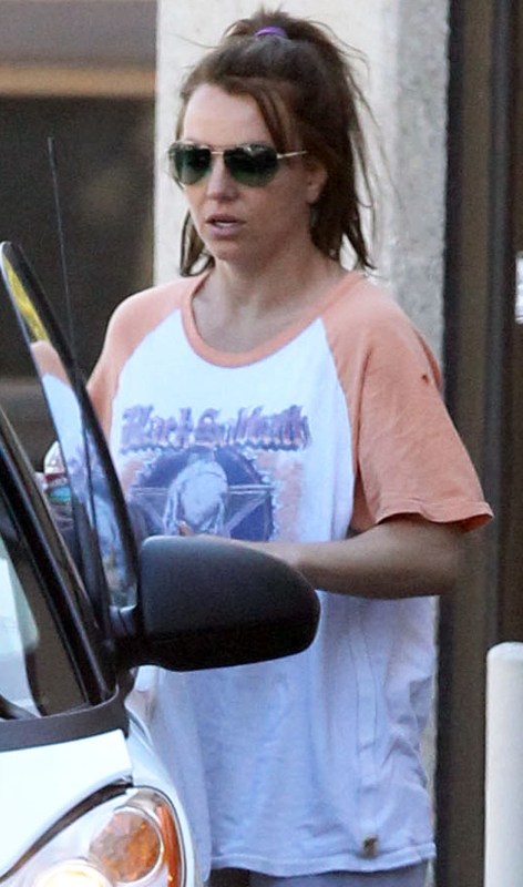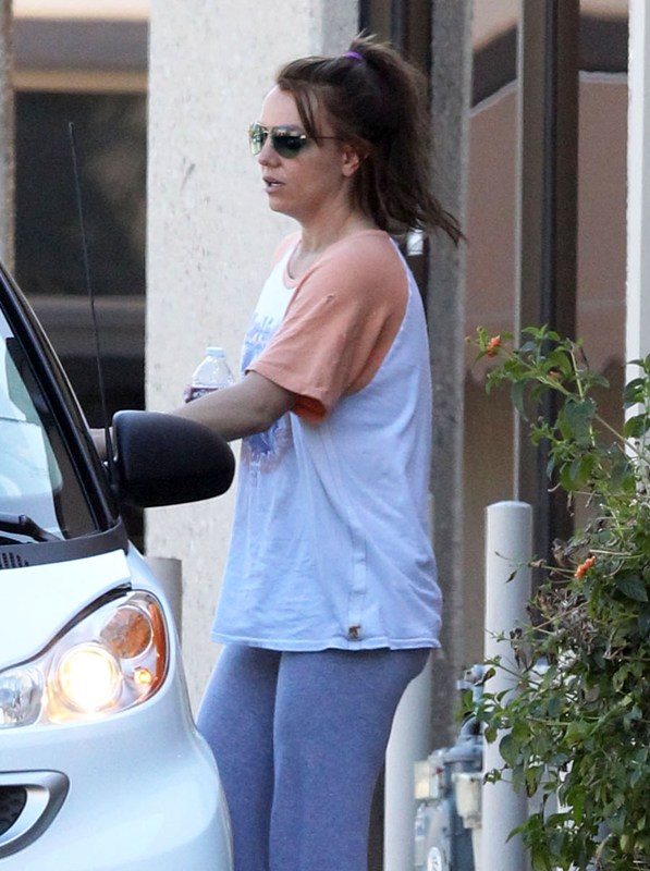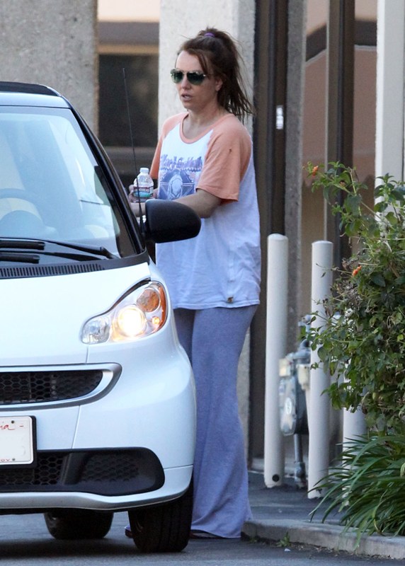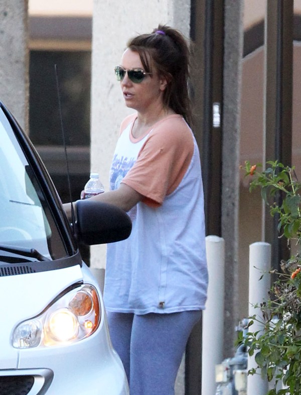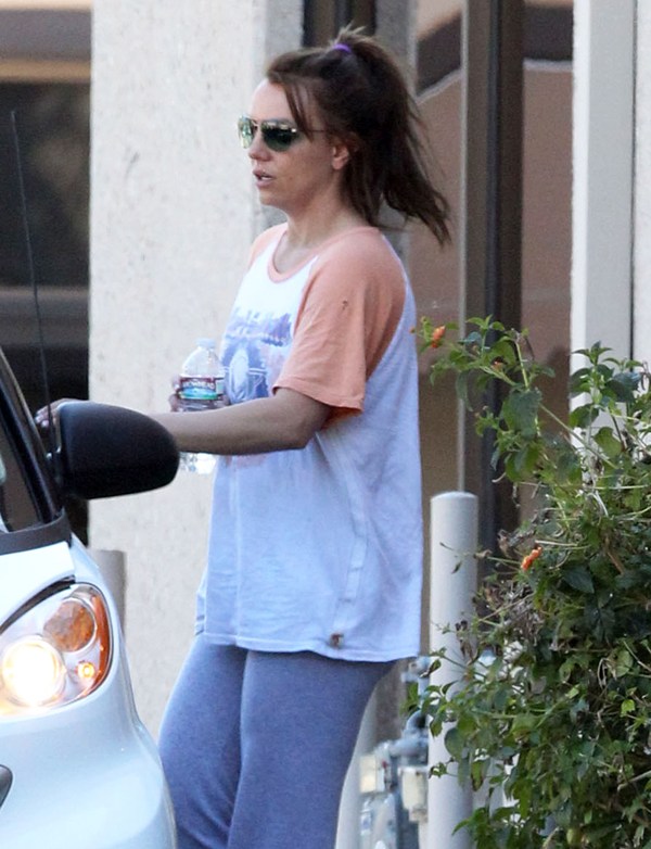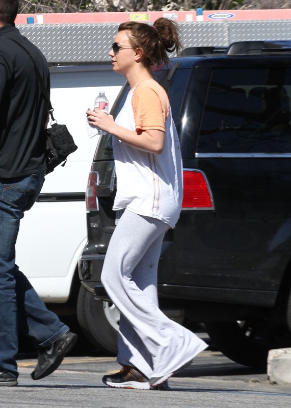 Here's the newly brown Britney back in sweats after premiering her new hair colour at Elton John's Oscar party on Sunday night. There was a man with her in the car. They say it's her new maybe-boyfriend, the "field researcher" who works at a law firm as identified last week -- click here for a refresher.