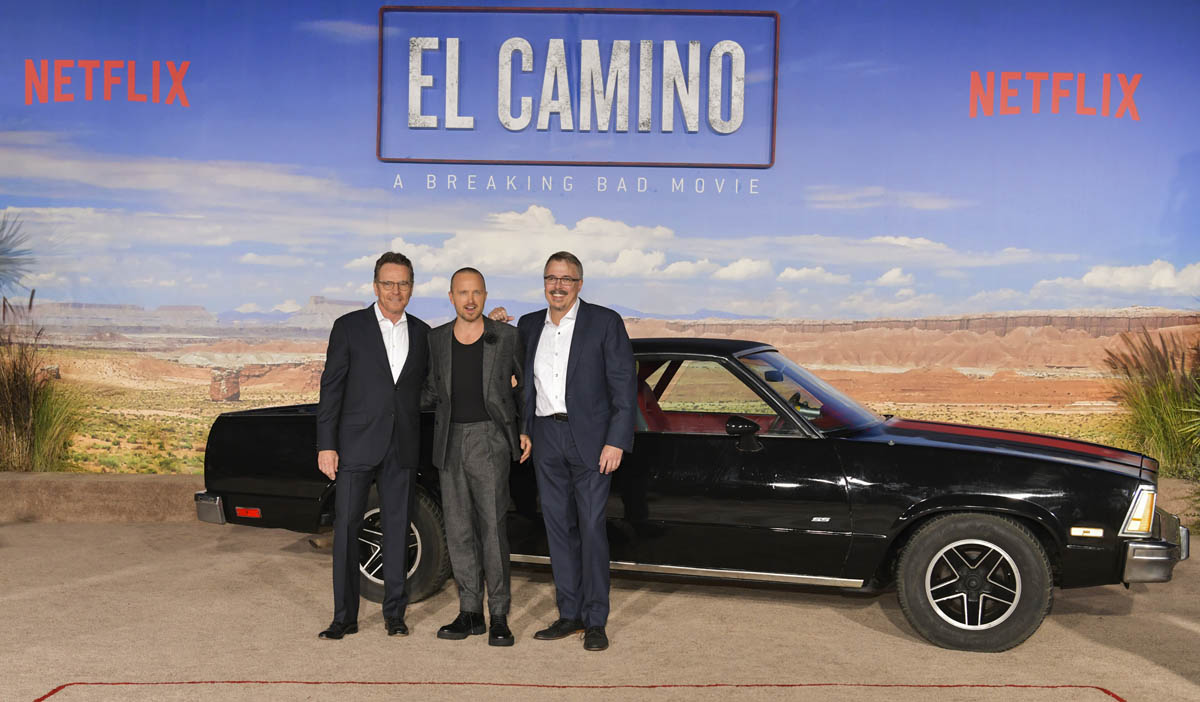 El Camino: A Breaking Bad Movie premieres on Netflix this coming Friday, just in time for Canadian Thanksgiving. Thanksgiving is all about gathering with family and/or friends and last night in Hollywood, Team Breaking Bad reunited at the premiere in support of the film. People got really into their feelings on Twitter last night at the sight of Bryan Cranston and Aaron Paul embracing and the two of them holding on to series creator Vince Gilligan. Look how cute they all are: