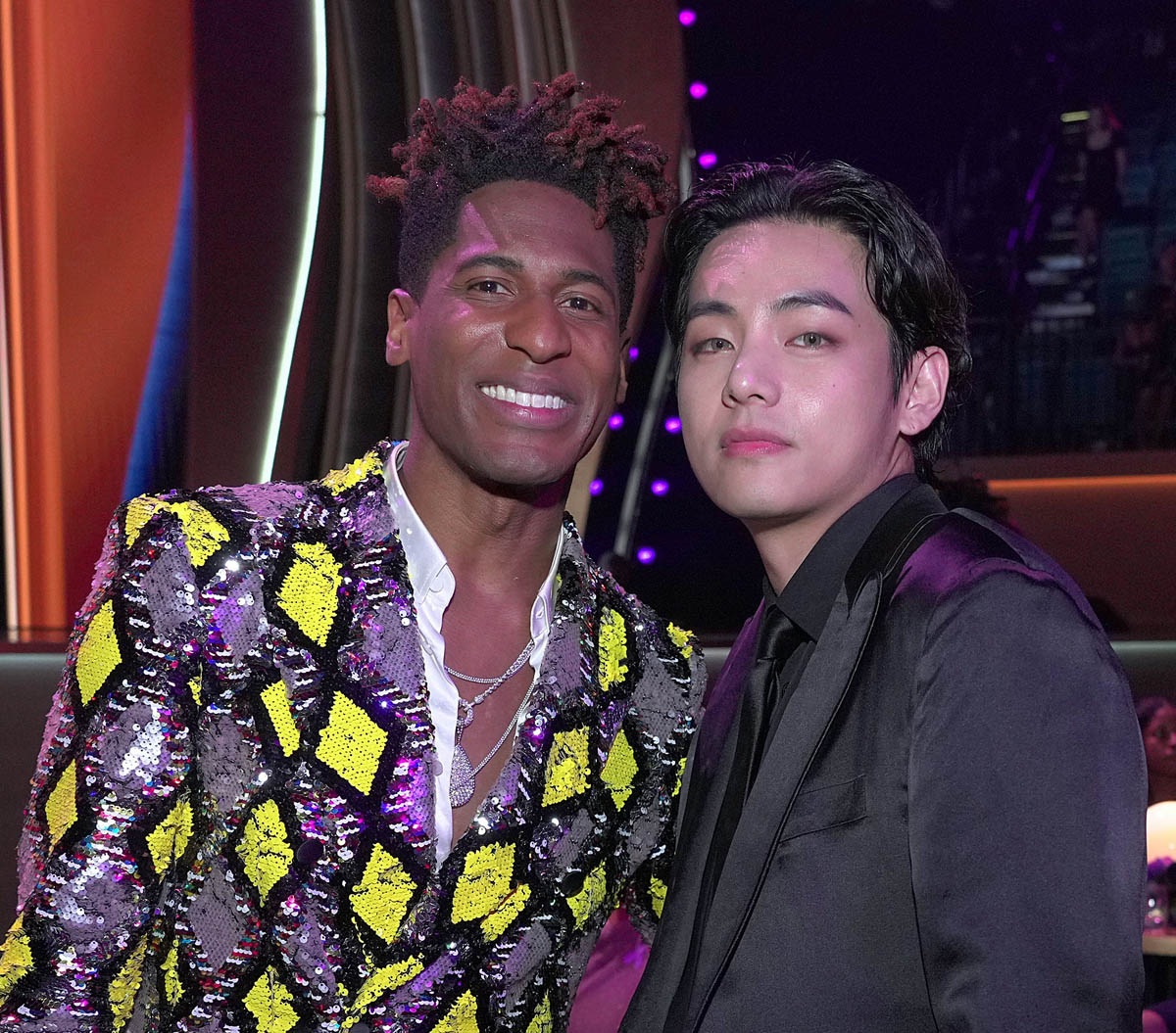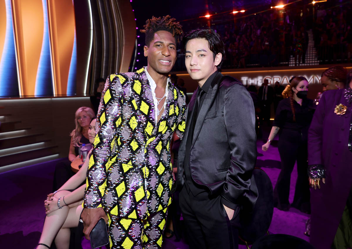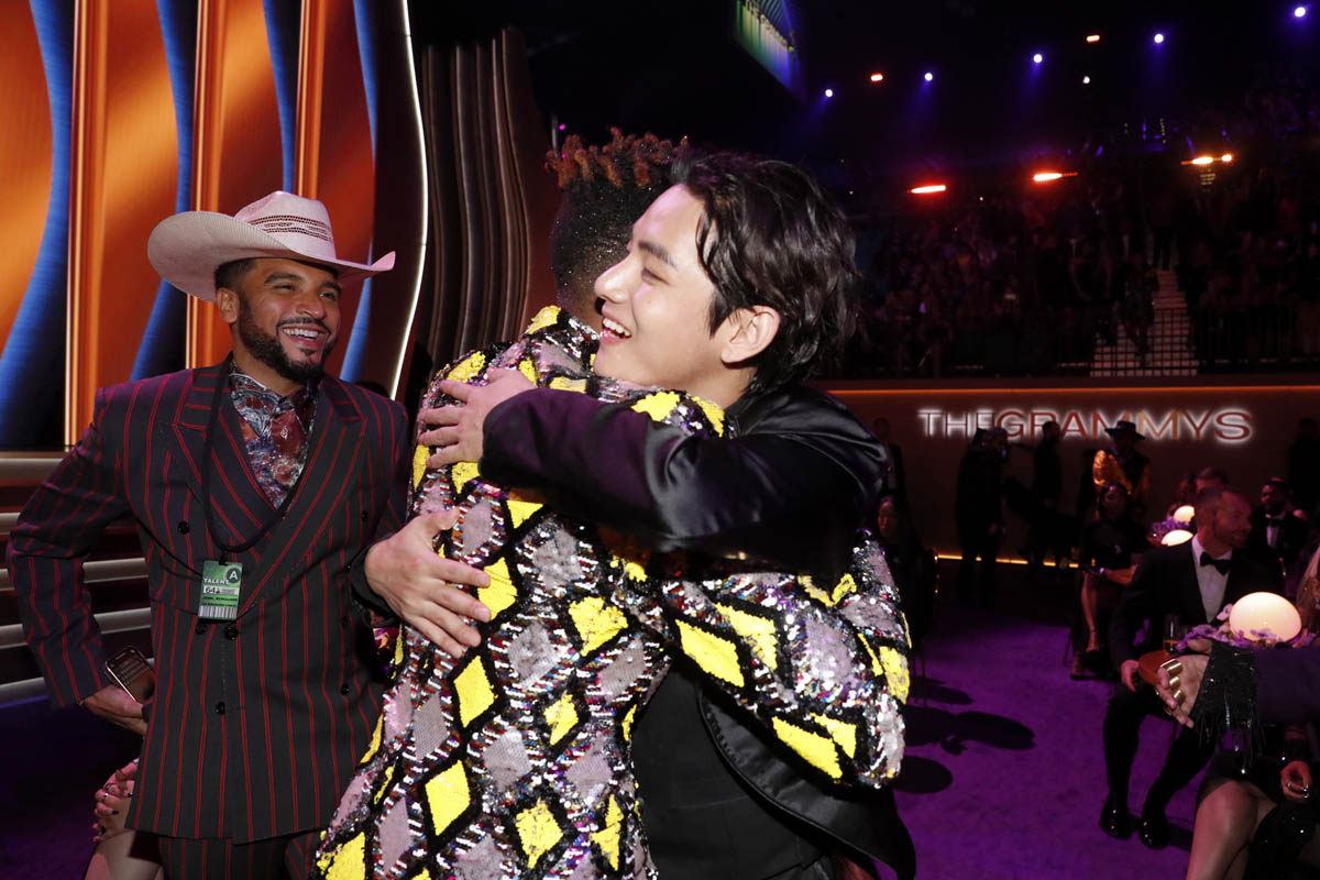 As we saw on Grammy night, especially the way that the theatre was set up, not unlike at the Oscars with the artists sat at cocktail tables on the floor, it gave celebrities more of an opportunity to hang out with each other during commercial break. At one point Jon Batiste, who won Album of the Year and accepted in a glorious tricked out cape, which we didn’t talk about enough yesterday, posed for a photo with BTS’s V.