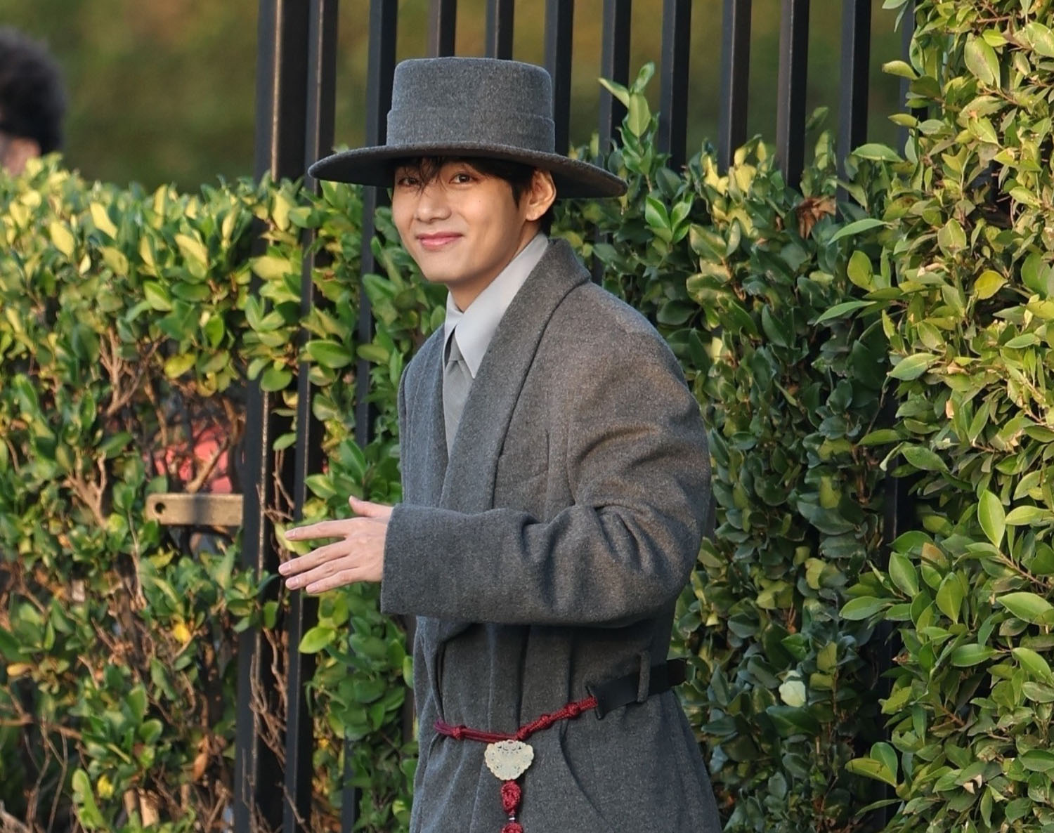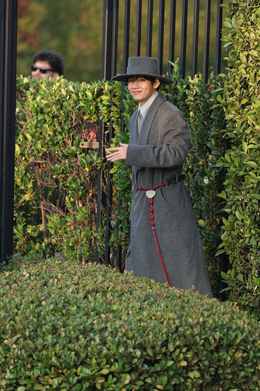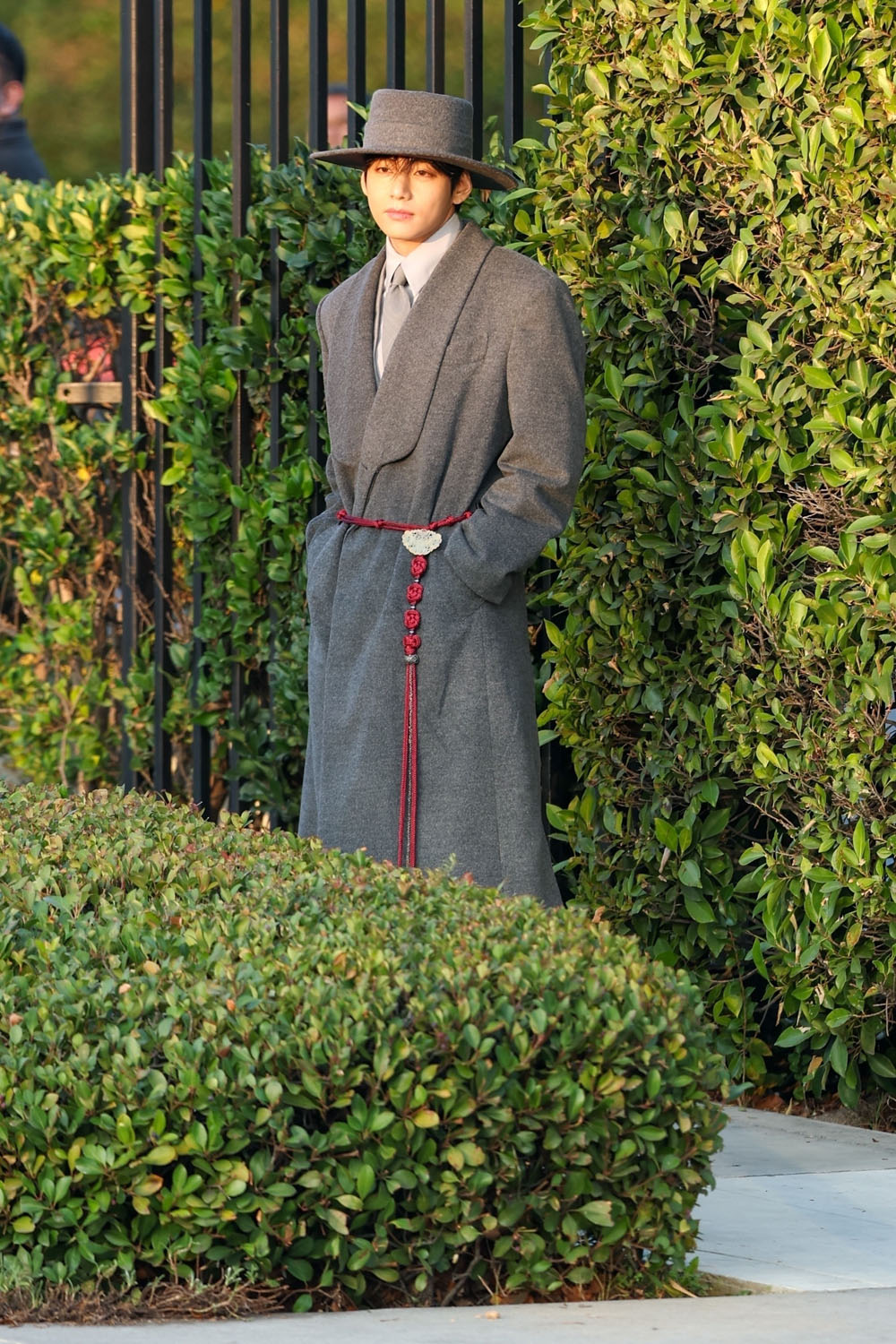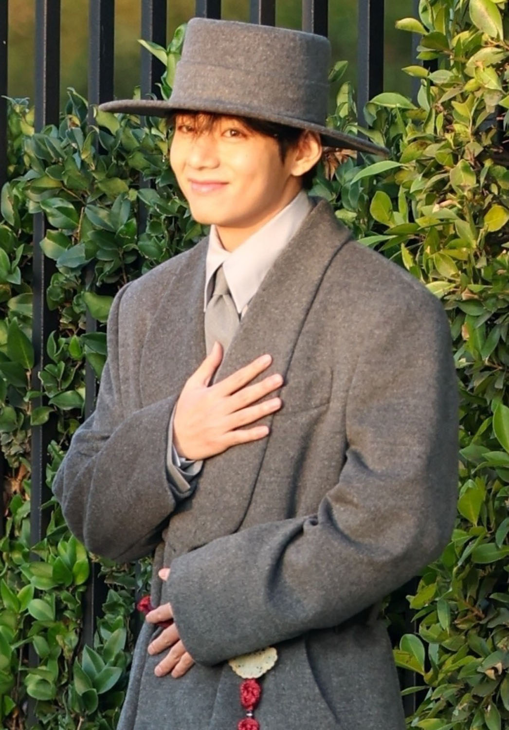 V’s wide-brim hat here can also be read as a gat, a Korean traditional men’s hat popularised in the Joseon period and also recognisable in the costuming of the Saja Boys of Kpop Demon Hunters when they’re in their demon form.