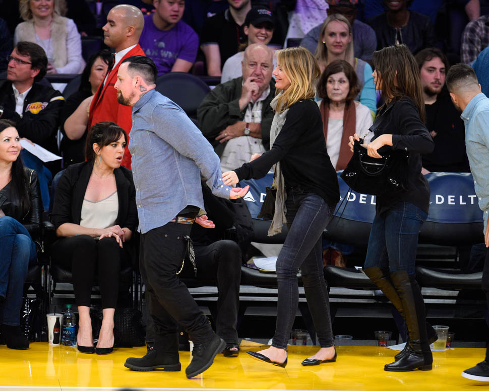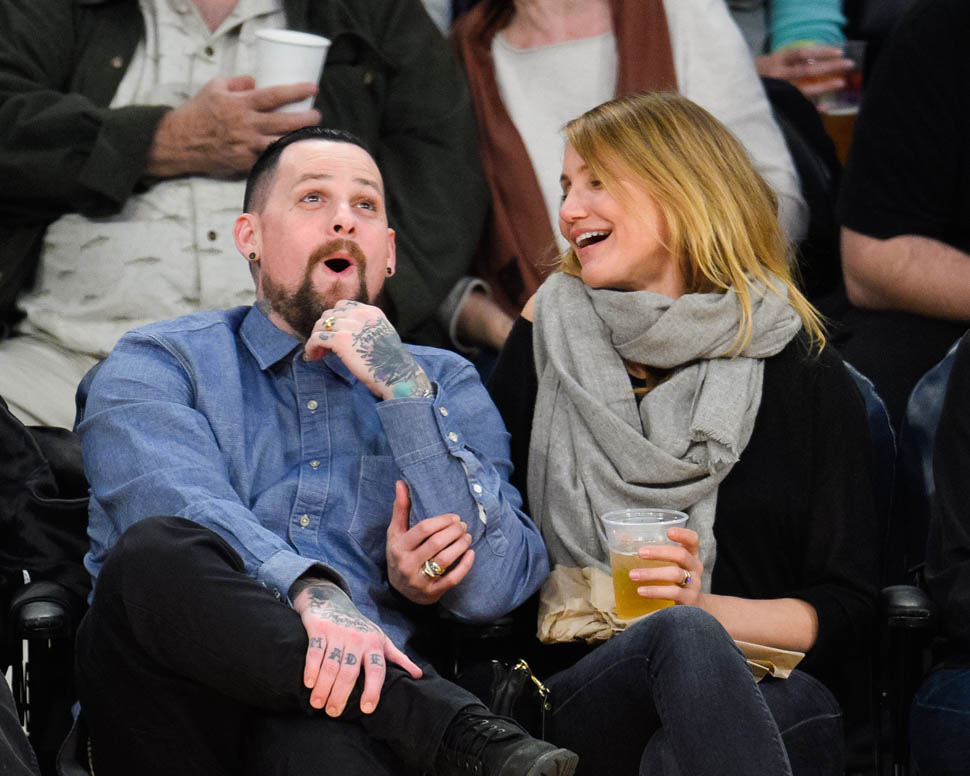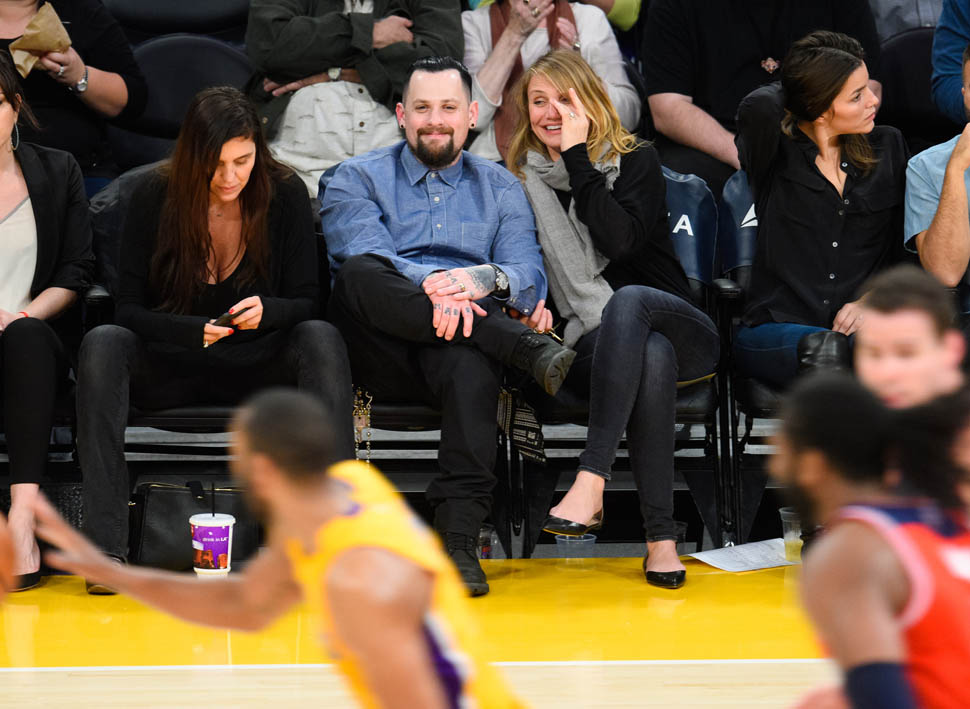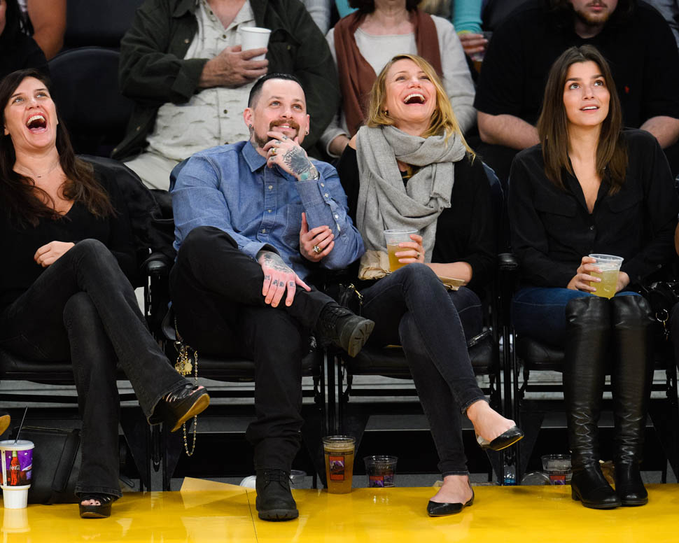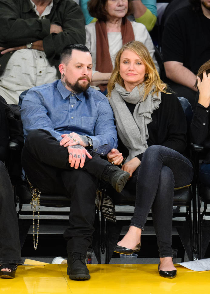 Cameron Diaz and Benji Madden were married three weeks ago. Last night they sat courtside at the Laker game, relaxed and happy. She just seems so...comfortable, right? That's my Photo Assumption of the scene.