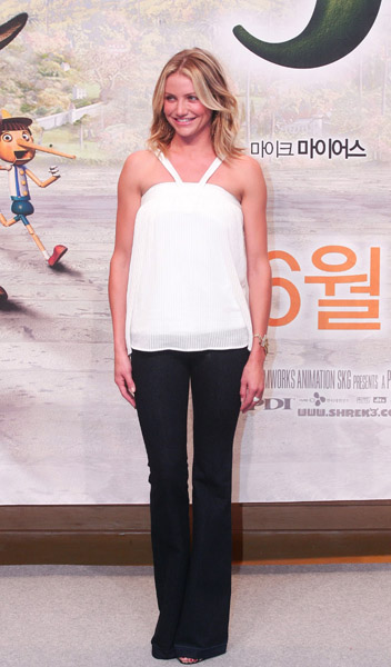 Which is why Cam is considering going in the opposite direction. Rumour has it, right now, she’s asking Rachel Zoe to find a very funky top to go over jeans, leaning towards playing it low key and letting the lapdog go overboard on effort. At press time, nothing firm. Will keep you posted, but if she looks anywhere near as cute as she did in Korea yesterday – see attached – I’m definitely behind the casual move. Check her out - long legs, glowing skin, adorable white blouse, and as always the best accessories.