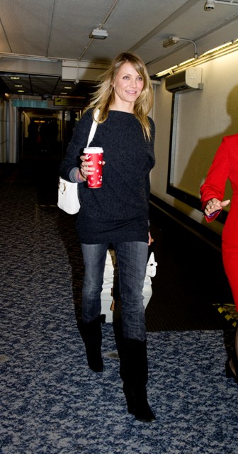 Cameron Diaz departed from Heathrow today en route to LA, headed home after spending new year’s with British boyfriend Paul Sculfor. She looks amazing, like she enjoyed herself. Am all over her travel wardrobe too. Comfortable but stylish and not completely ridiculous like Posh.